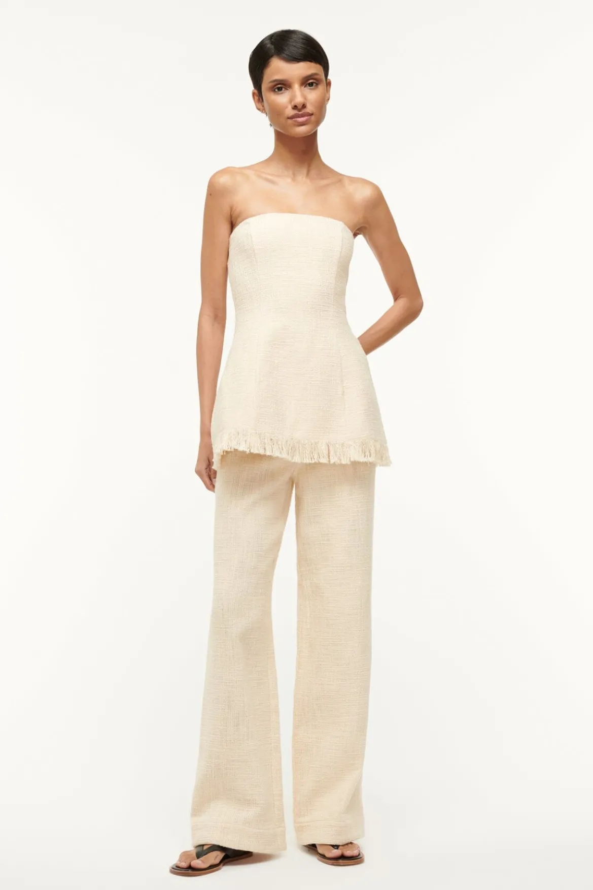 The Silvia Top is a strapless peplum style top with shaping at the hips and a fringe hem. The Silvia can be paired with the Grayson Pant for a matching set.