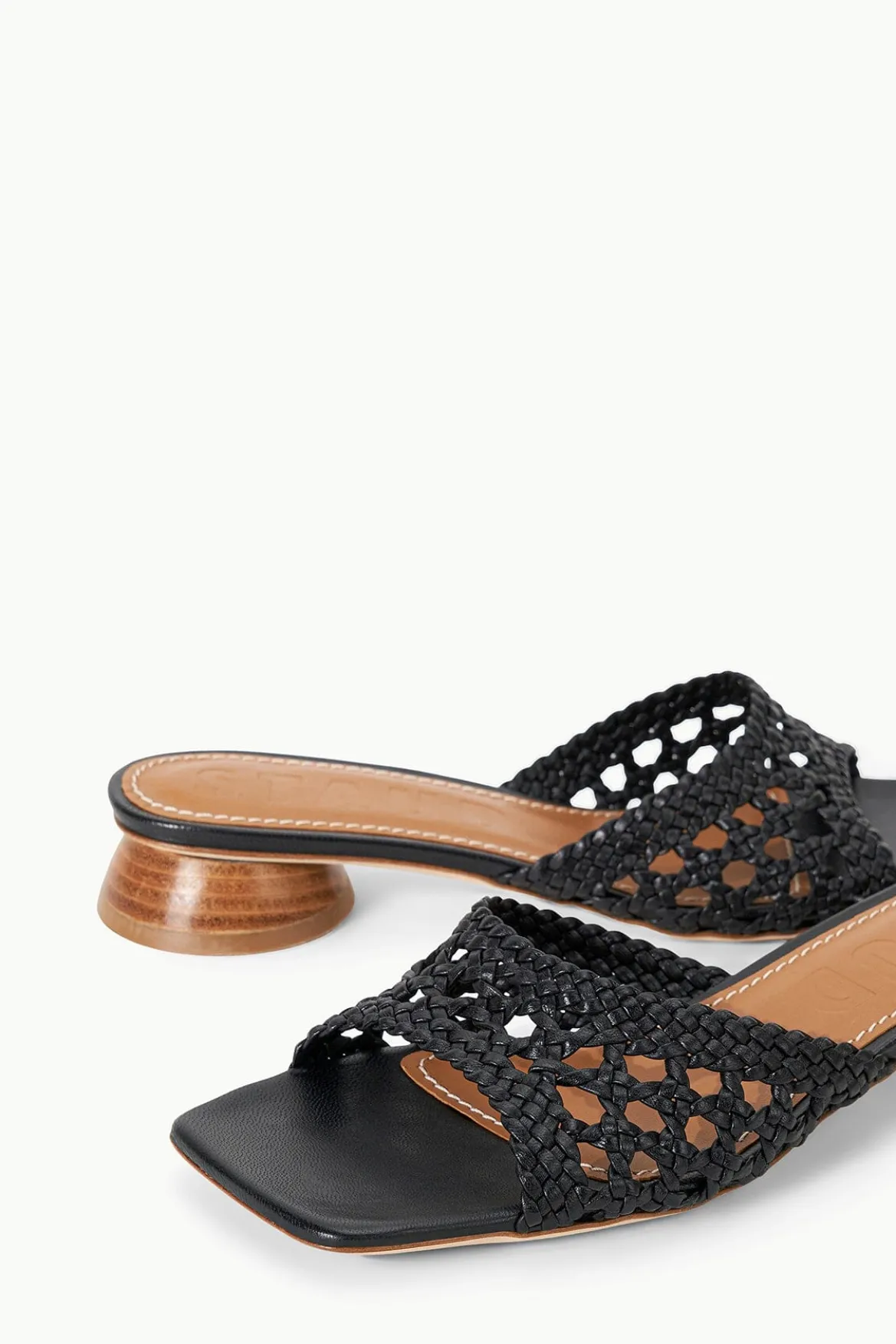 A hand-woven update to the STAUD classic Simone Mule, this style features a wood-covered sculptural low heel and square toe.