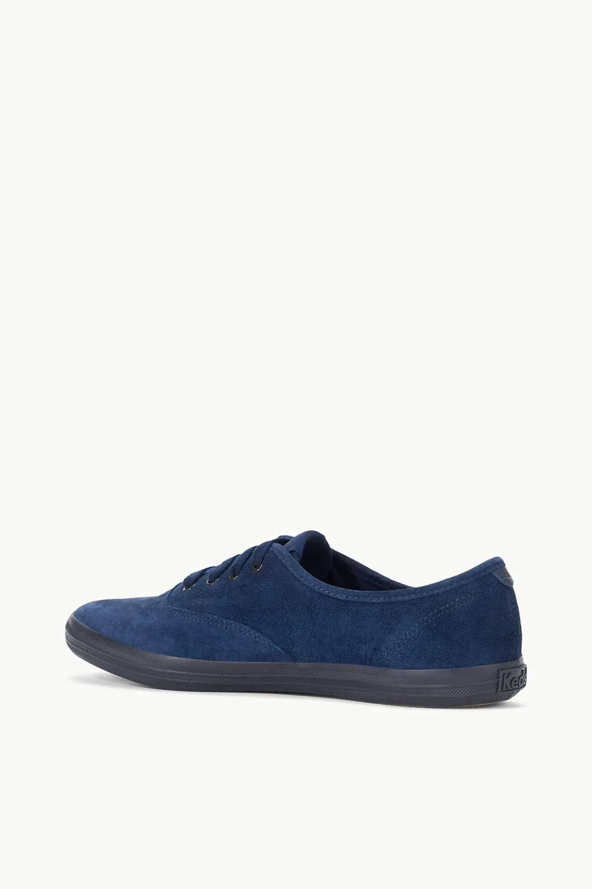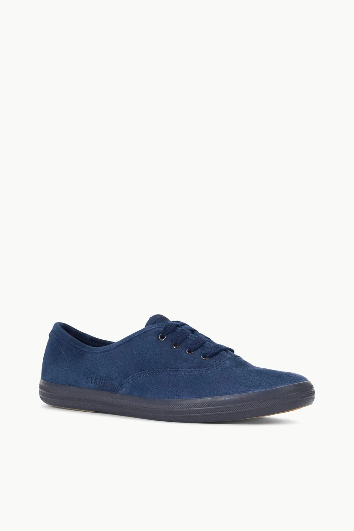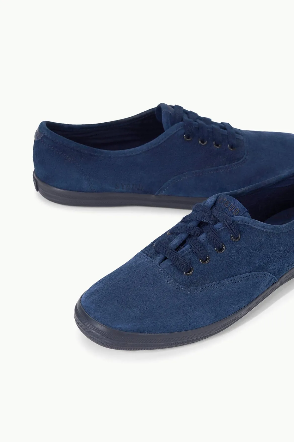 Introducing the STAUD + Keds Champion Sneaker, a timeless and instantly recognizable design, elevated with a navy blue suede upper. The Champion Sneaker is a lace-up suede shoe, featuring a rubber sole and STAUD tonal embroidery.