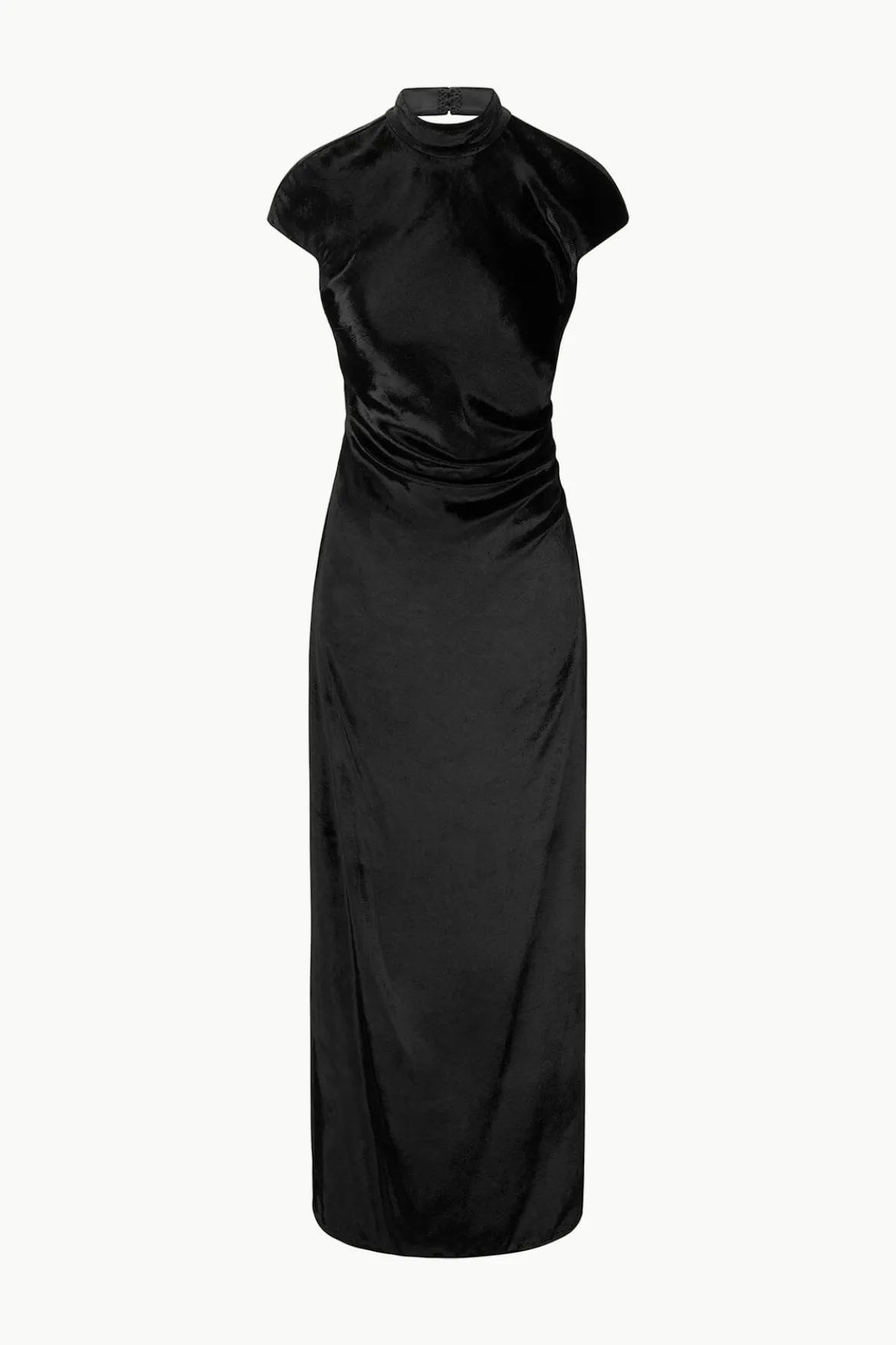The Tina Dress is a mock neck gown with cap sleeves, asymmetric draping at the waist and an open back.