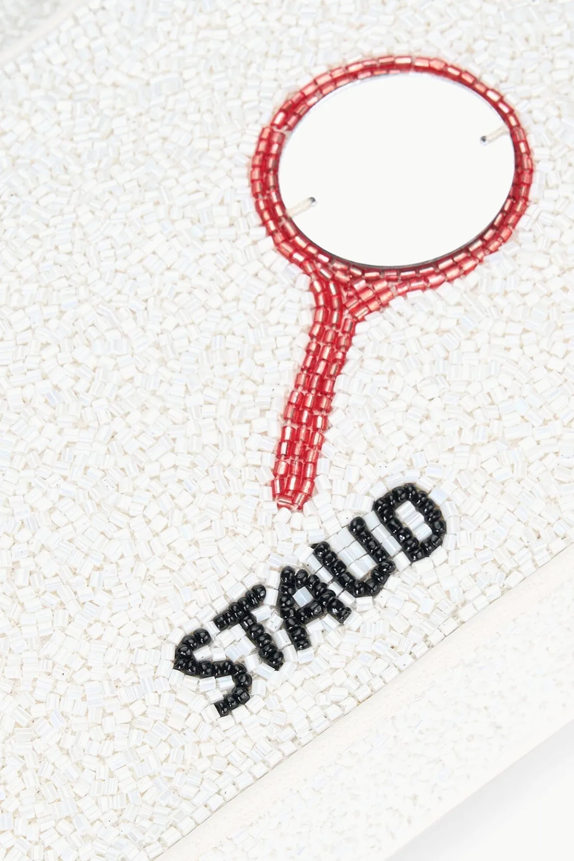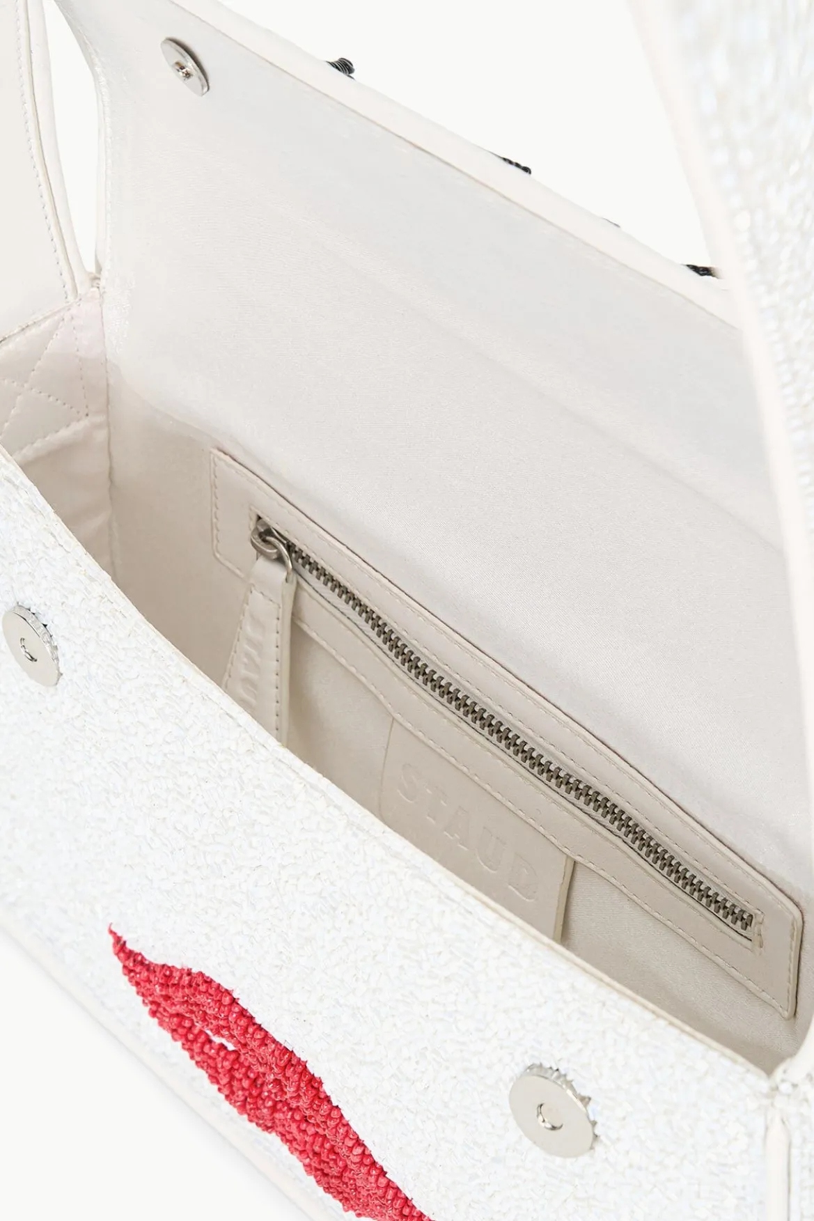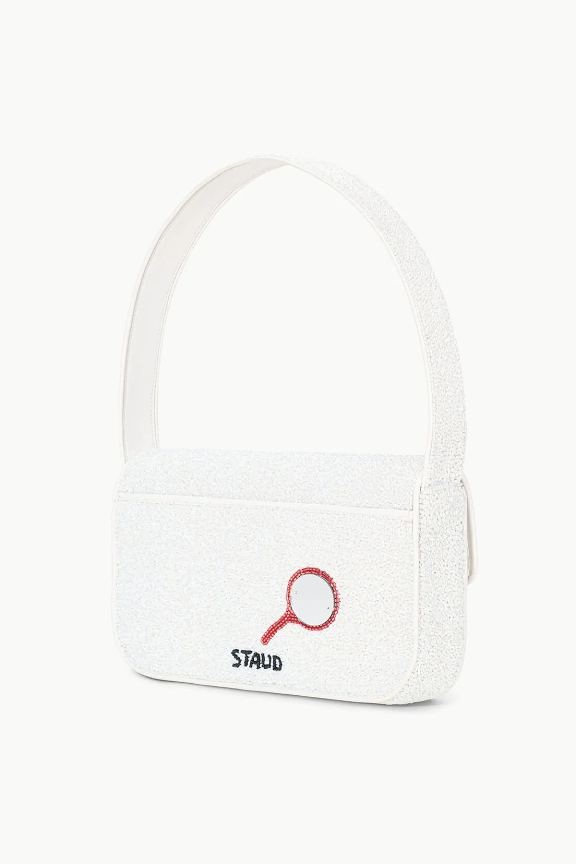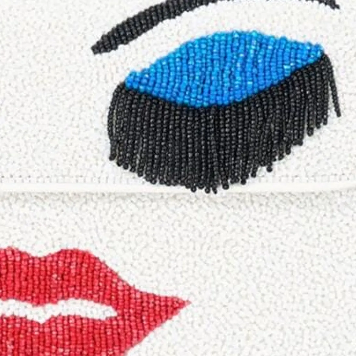 Our best-selling, hand-beaded shoulder bag has been updated with a playful print featuring fringe eyelash details. The Tommy features vegan leather piping, a back slip pocket, magnetic snap closure, and interior satin lining.
