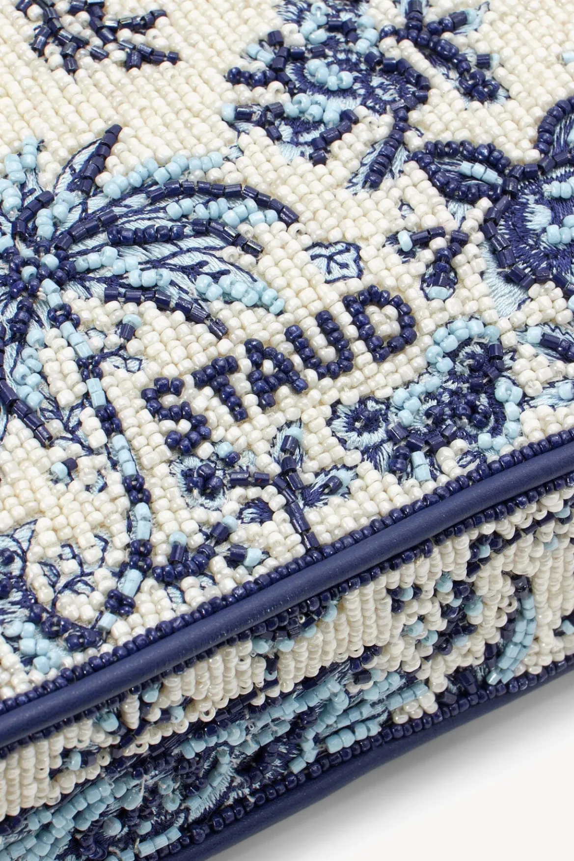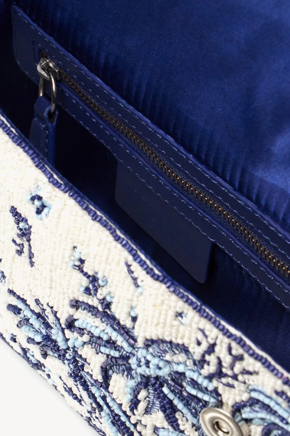 The Tommy Bag is a hand-beaded shoulder bag with vegan leather piping. This style features a single flap closure, inner zip pouch and magnetic pocket on the back.