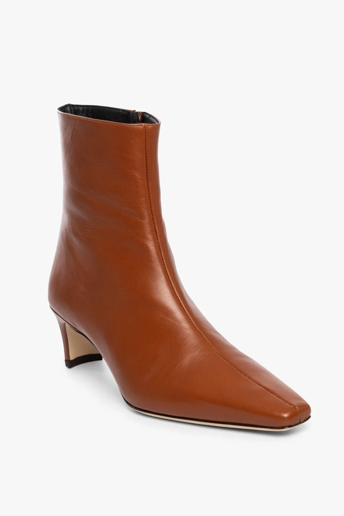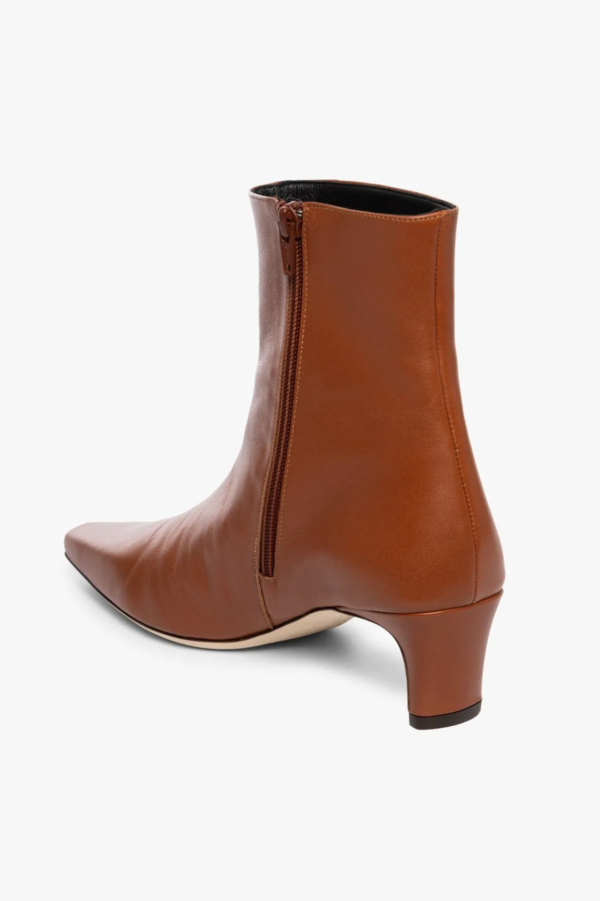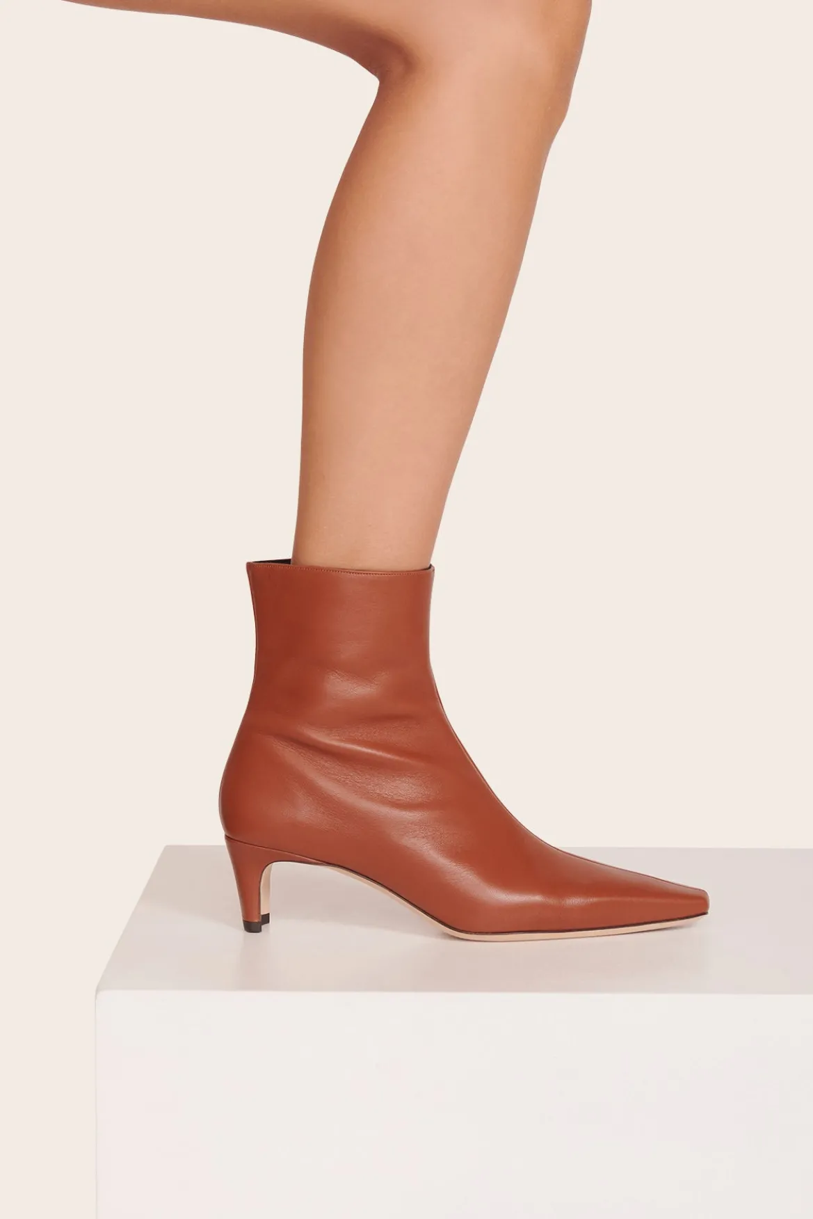 A nappa leather ankle boot, this style features a pointed rectangular toe and a blade heel. The Wally Ankle boot features a side zip closure.