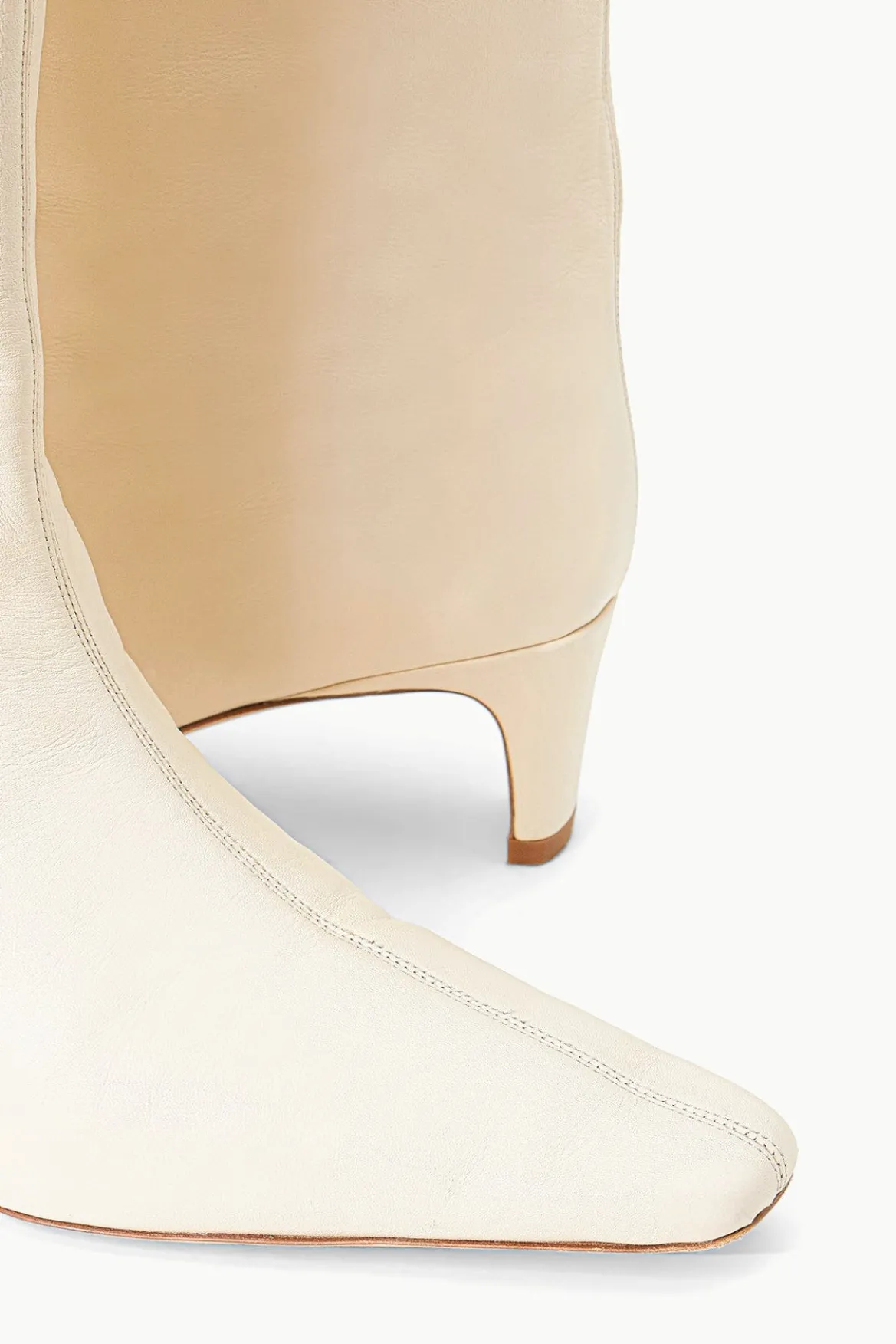 The Wally is a leather knee-high boot featuring a pointed toe and a slim heel design.