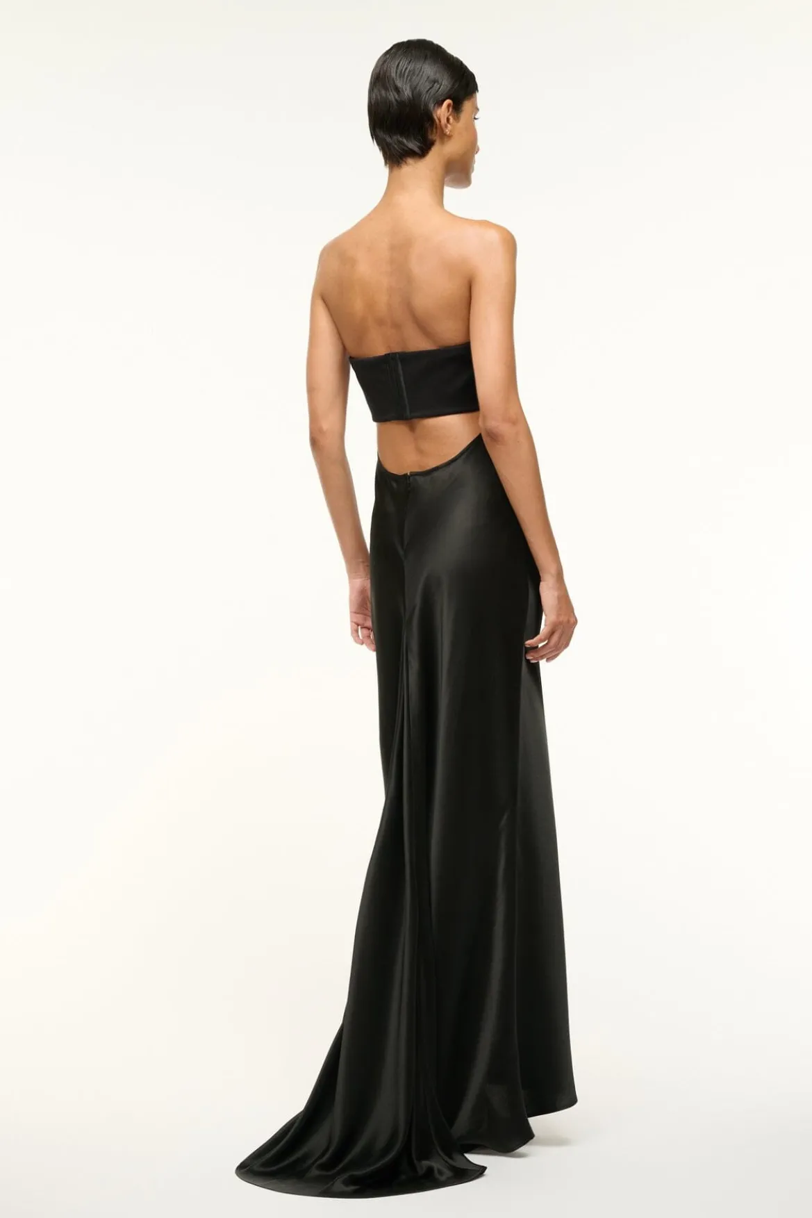 The Wayfaring Dress is a timeless evening gown with a ponte bodice and a ruched satin skirt. This strapless dress features a strapless bra-friendly bodice, with an open lower back.