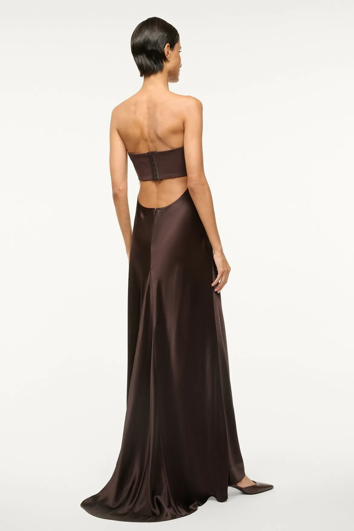 The Wayfaring Dress is a timeless evening gown with a ponte bodice and a ruched satin skirt. This strapless dress features a strapless bra-friendly bodice, with an open lower back.