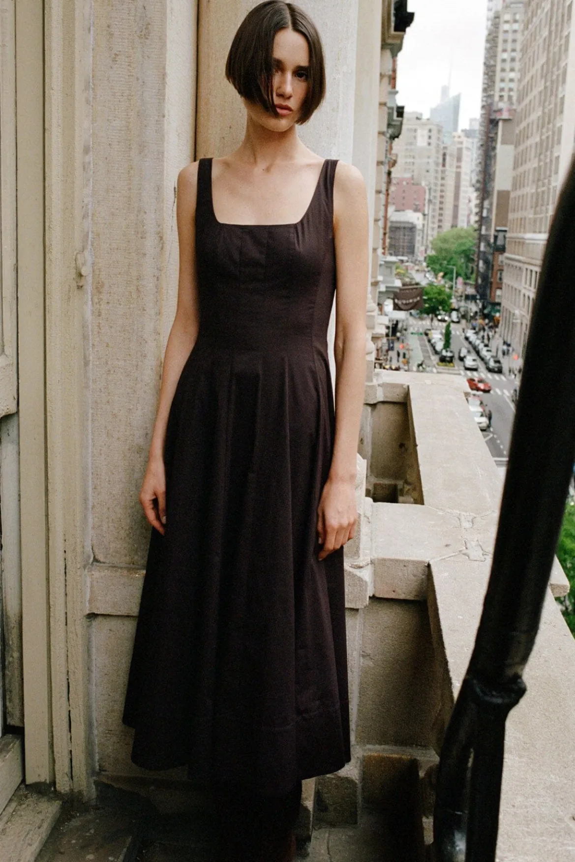 The Wells Dress features a corset-style panel construction to create a flattering, fitted shape through the waist and a full skirt which hits just below the knee. Constructed in lightweight cotton poplin.