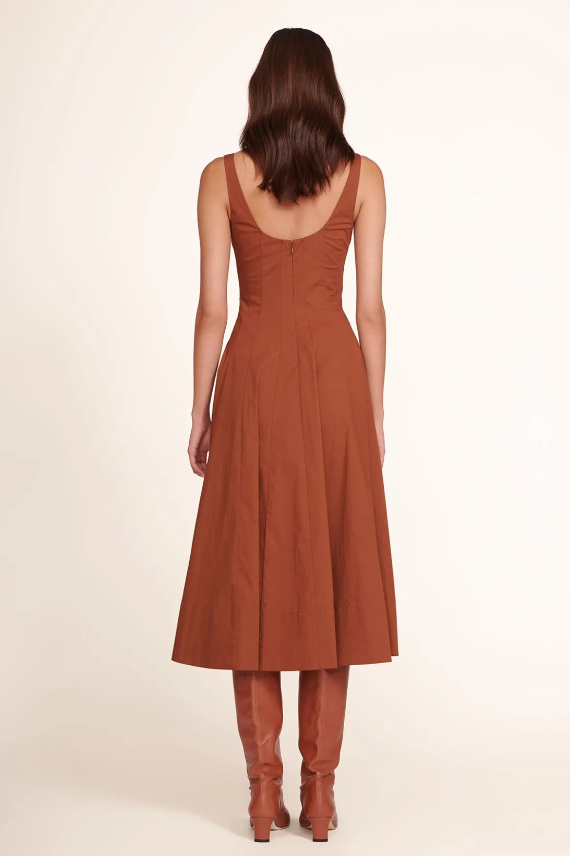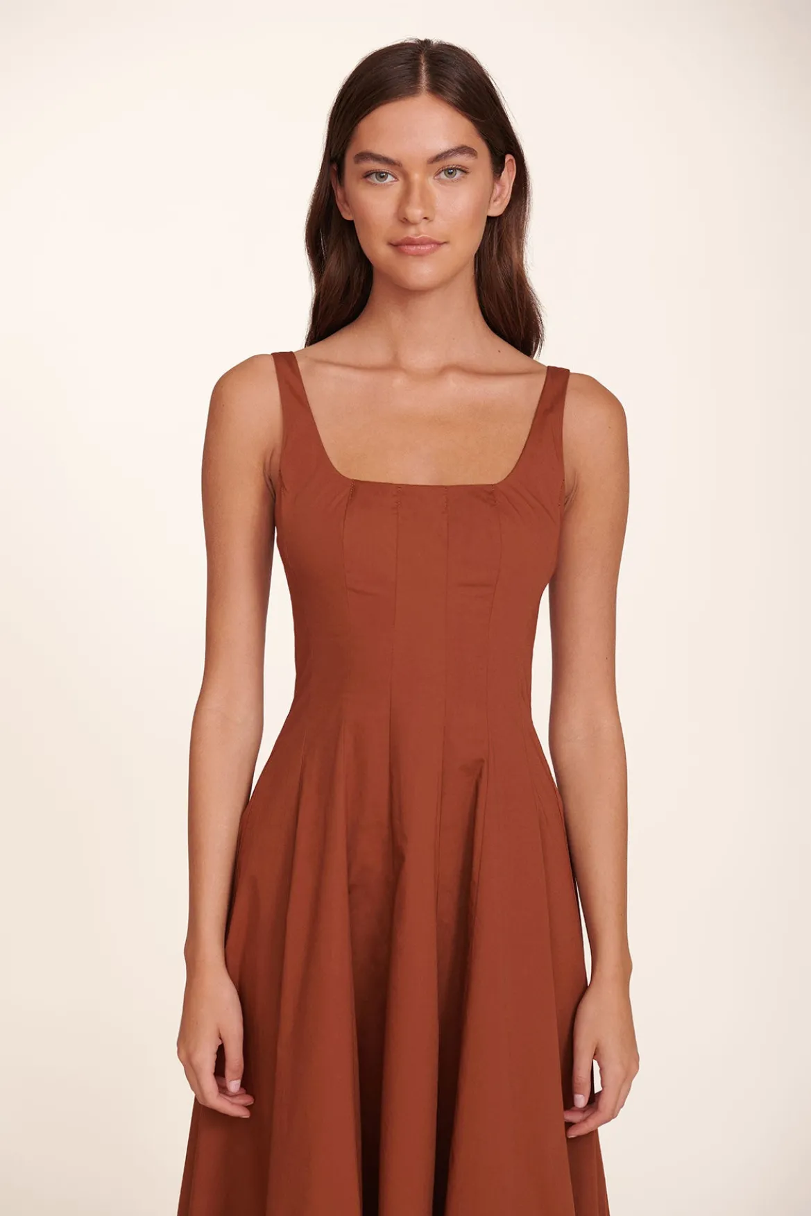The Wells Dress features a corset-style panel construction to create a flattering, fitted shape through the waist and a midi length a-line skirt. Made out of lightweight cotton poplin.
