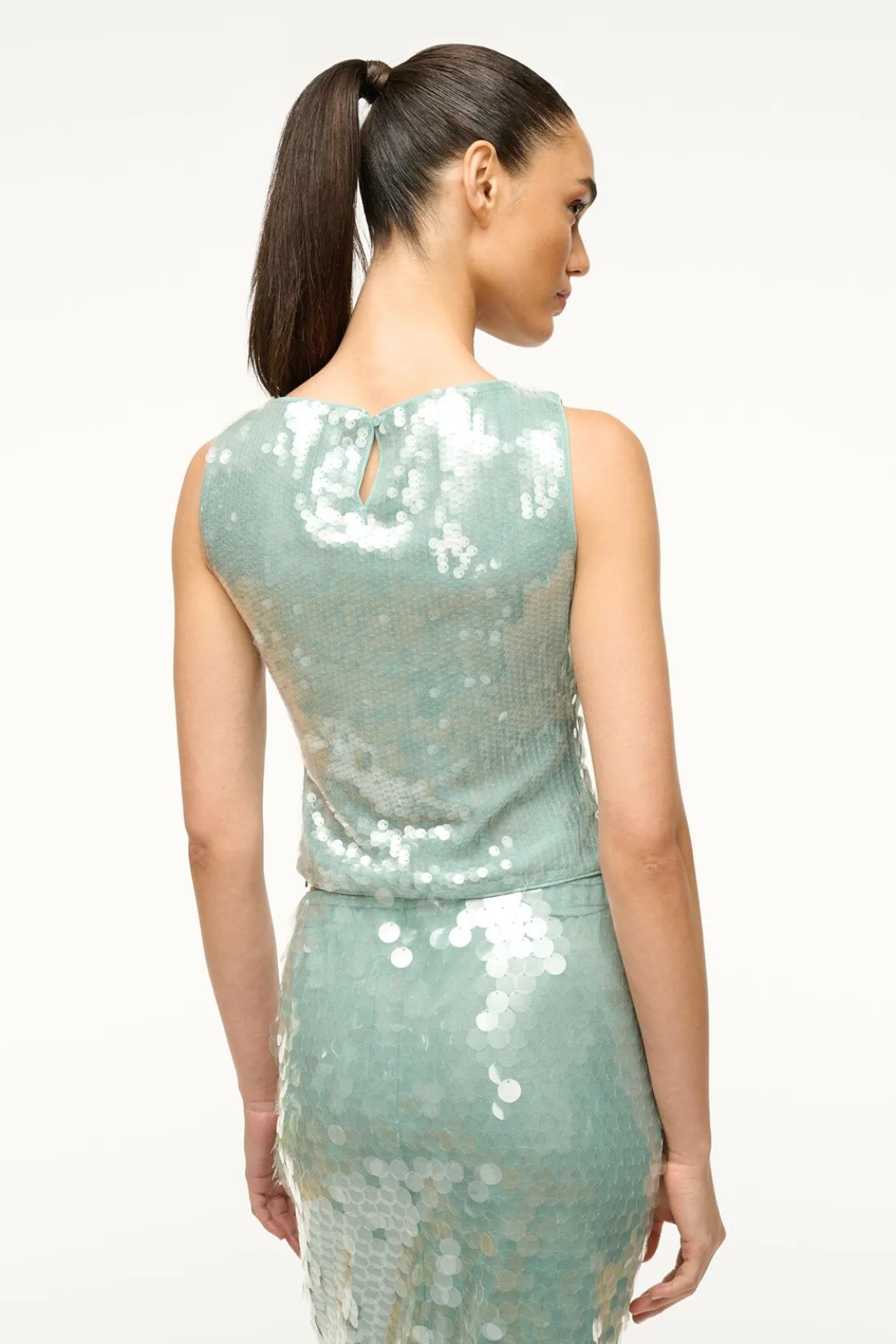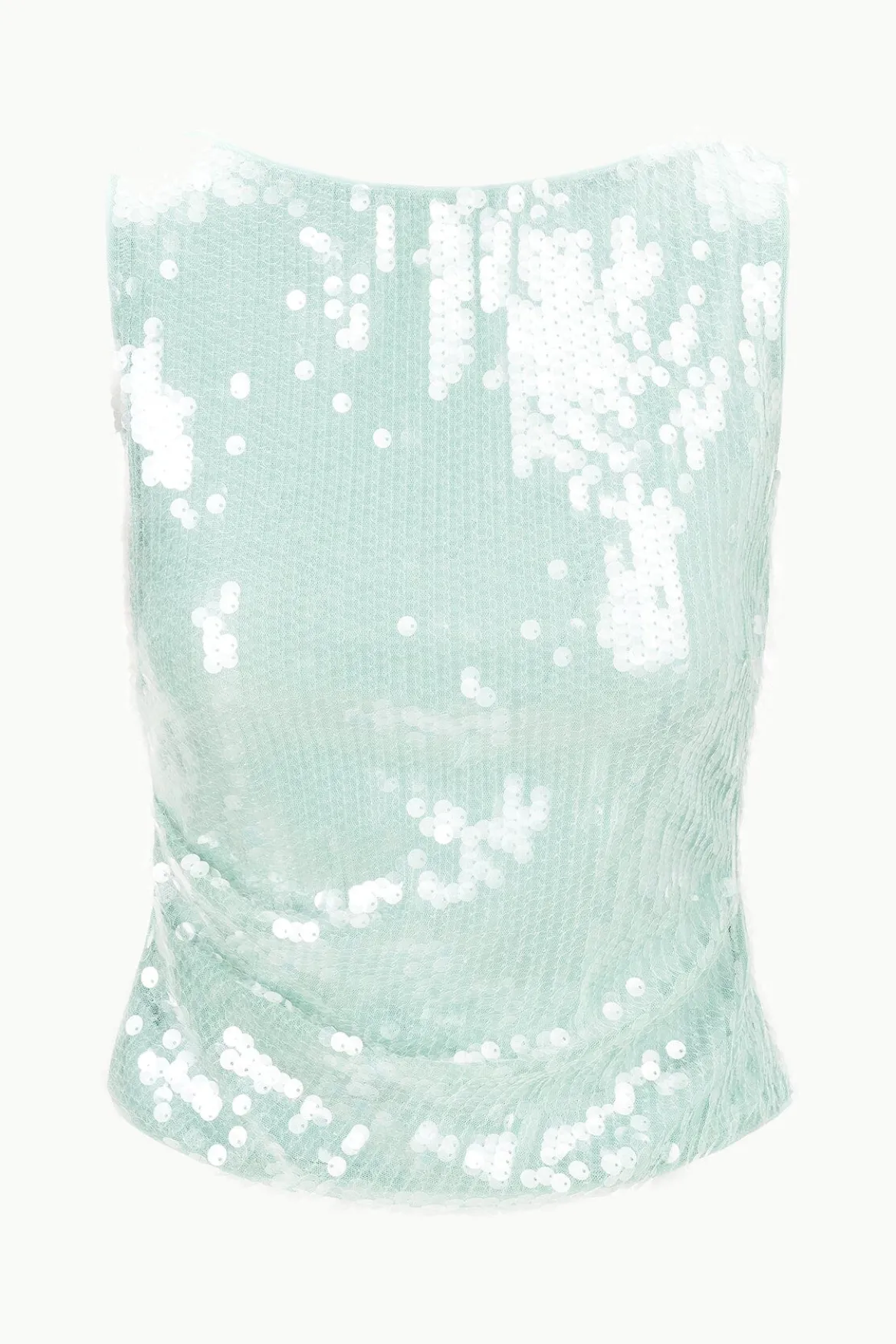 The Eton Top is a boatneck sequined top with asymmetric draping at the waist and a button closure. It can be paired with the Casey Skirt for a matching set.