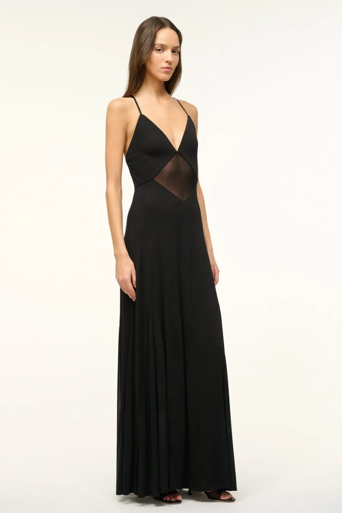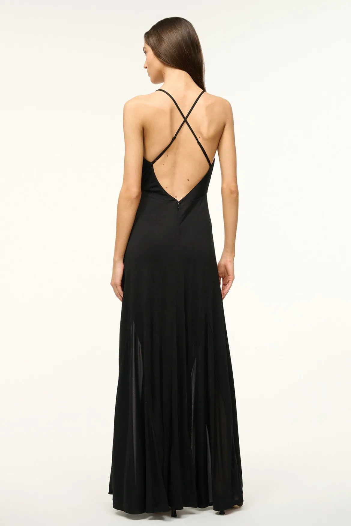 A jersey maxi dress with low v neck, the Fleur features mesh panel details and a low back with criss-cross straps.