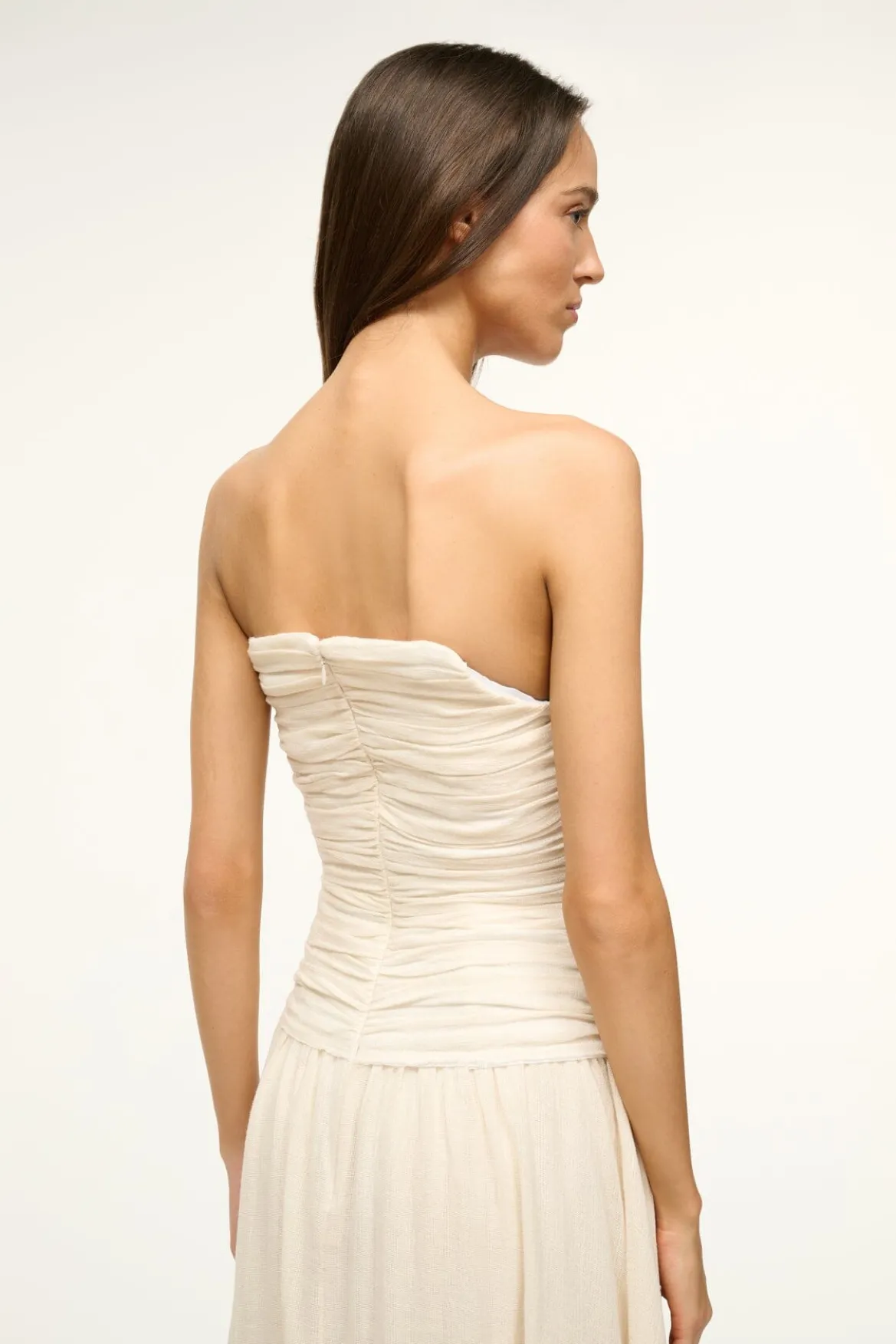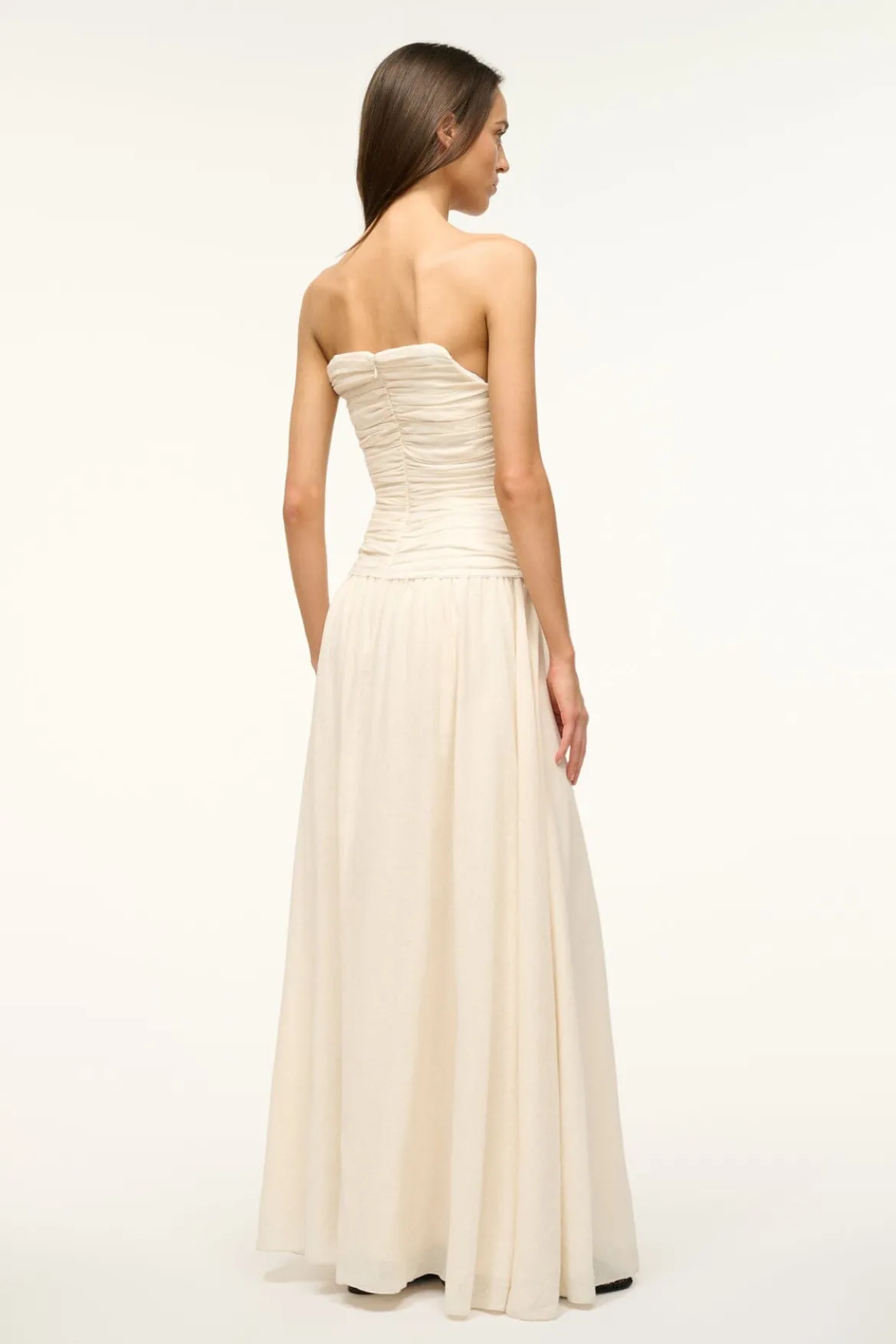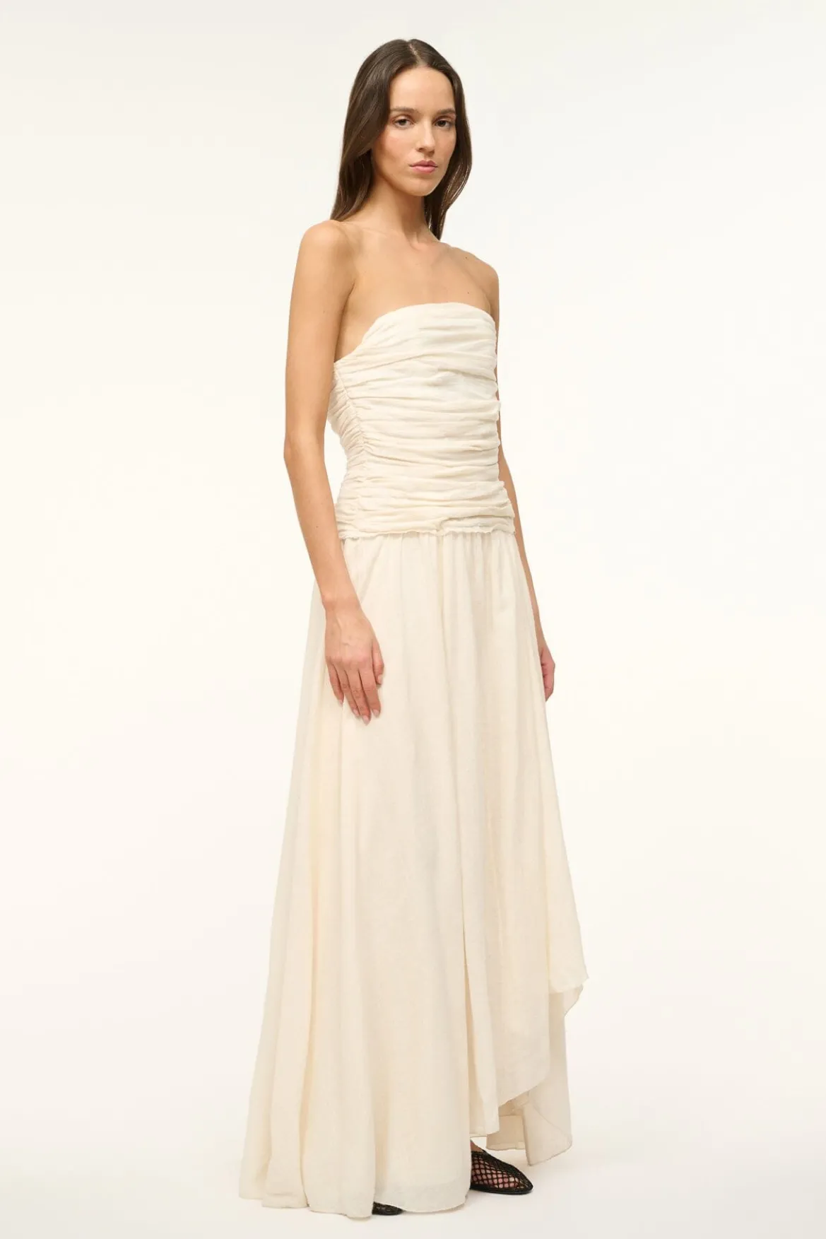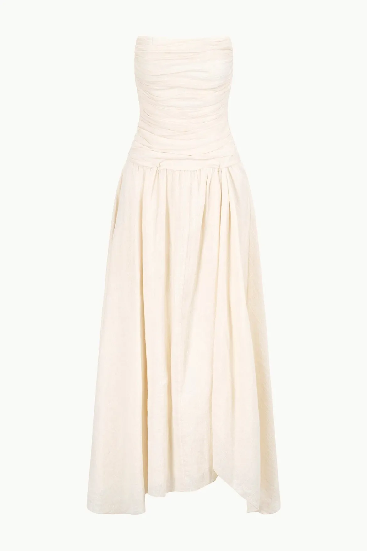The Hightide is a maxi length strapless dress with a gathered corset bodice and asymmetrical hemline.