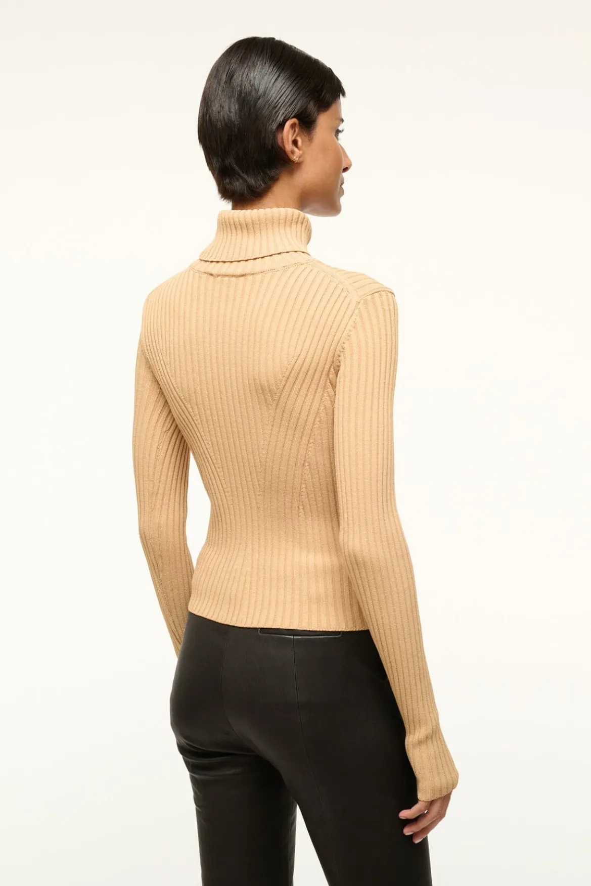 A fitted, long sleeve turtleneck, the Jace Top offers an essential layering piece for any seasonal transition. This style is made out of a rib knit fabric with fully fashioned directional pattern.