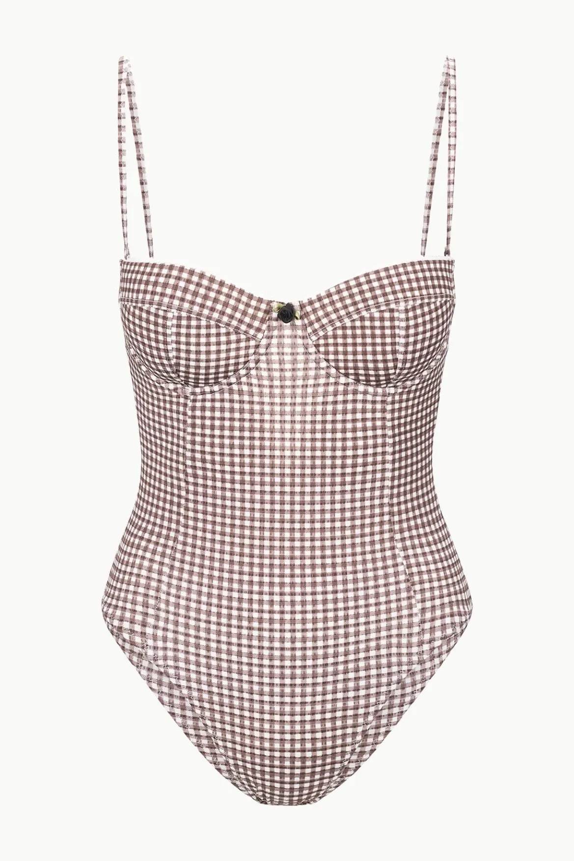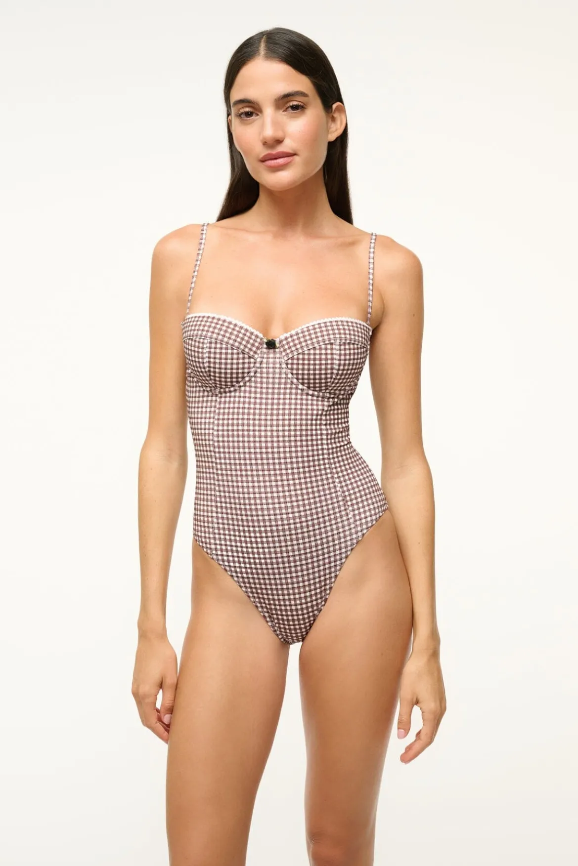 The Maeve One Piece features a bustier inspired bodice with a contrast trim at the bust. This style has removable spaghetti straps and a low back.