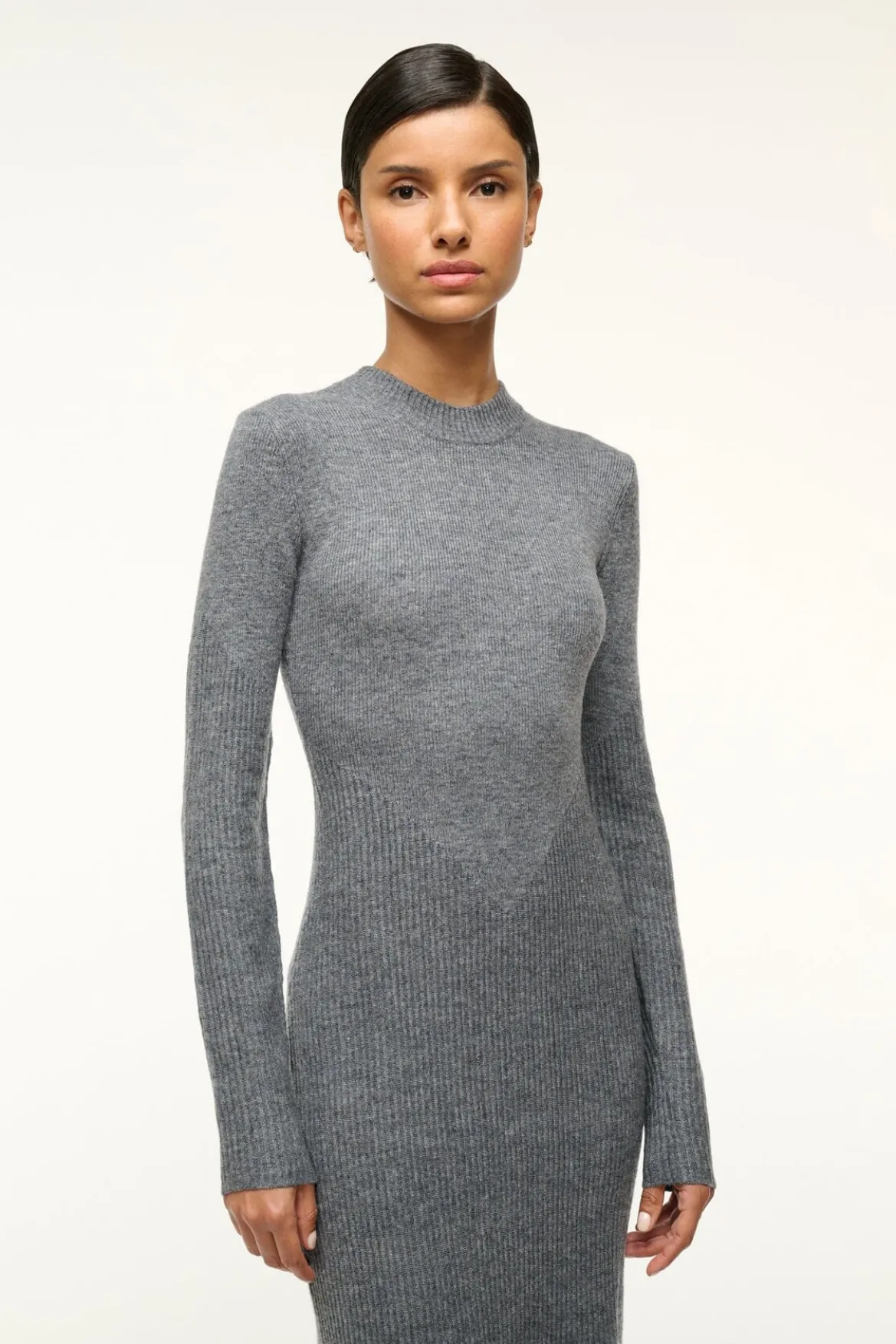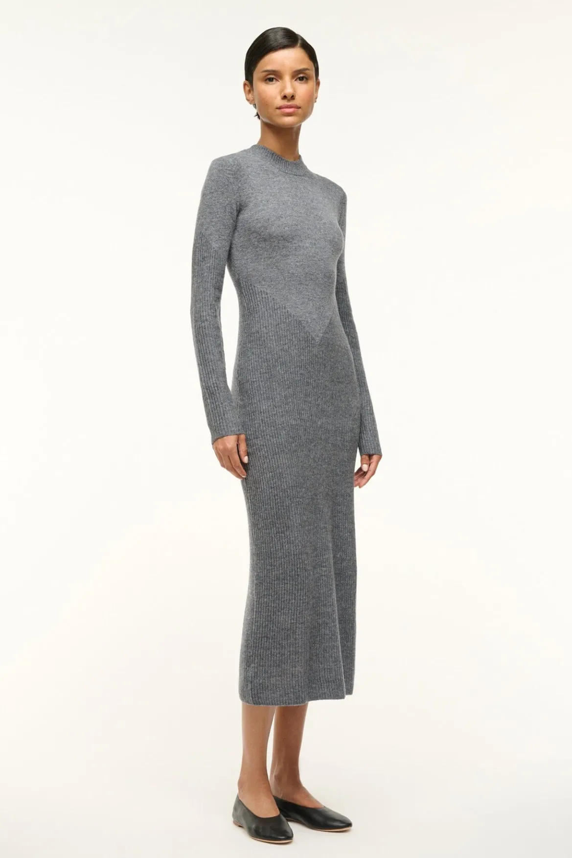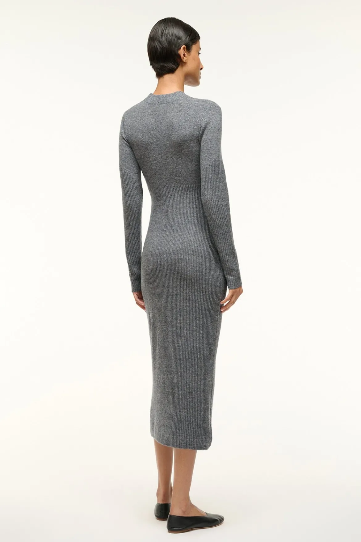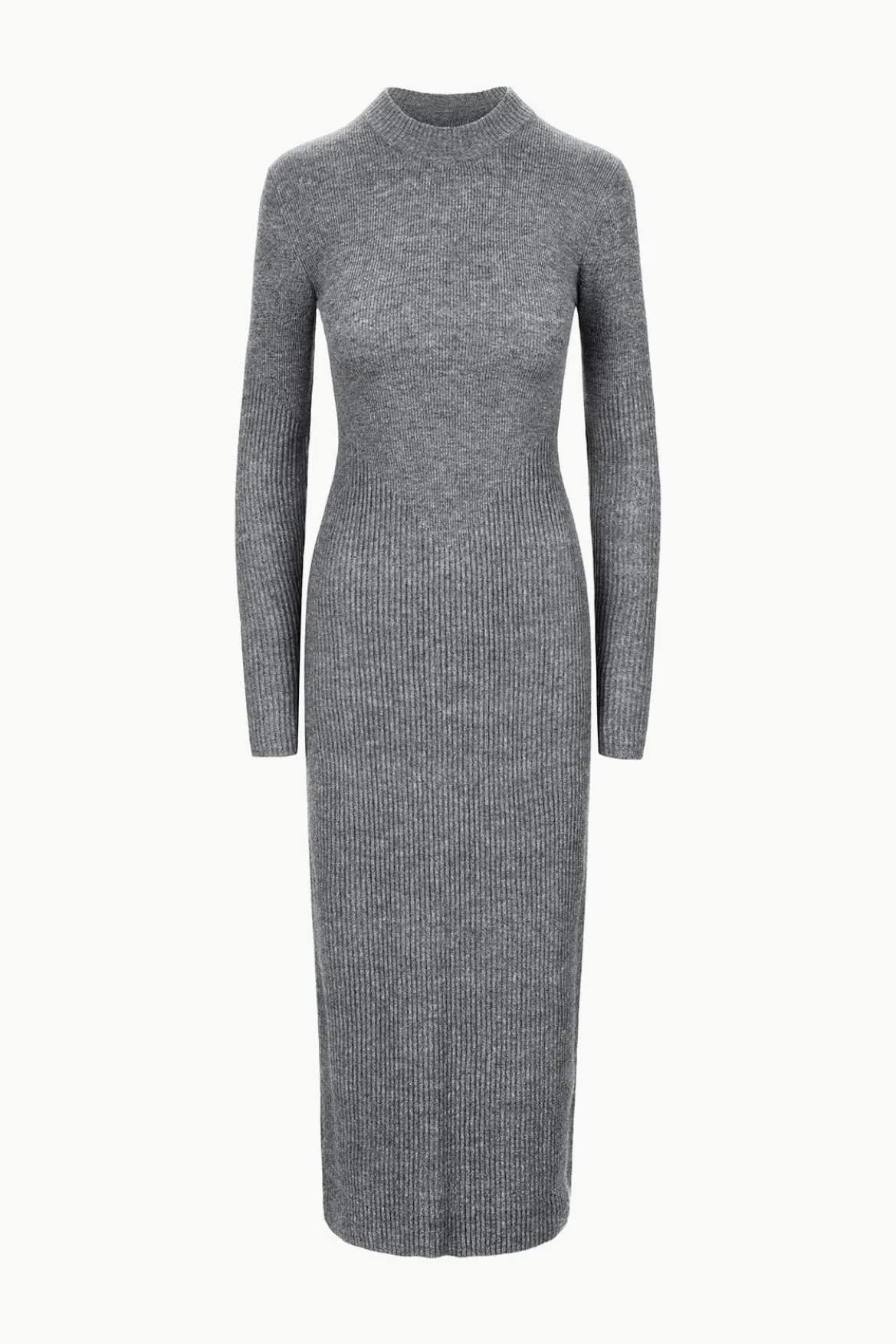 The Ramona Dress is a long sleeve fitted midi dress in a soft merino knit. This style has a mock neck and has ottoman stitch detailing for a flattering fit.