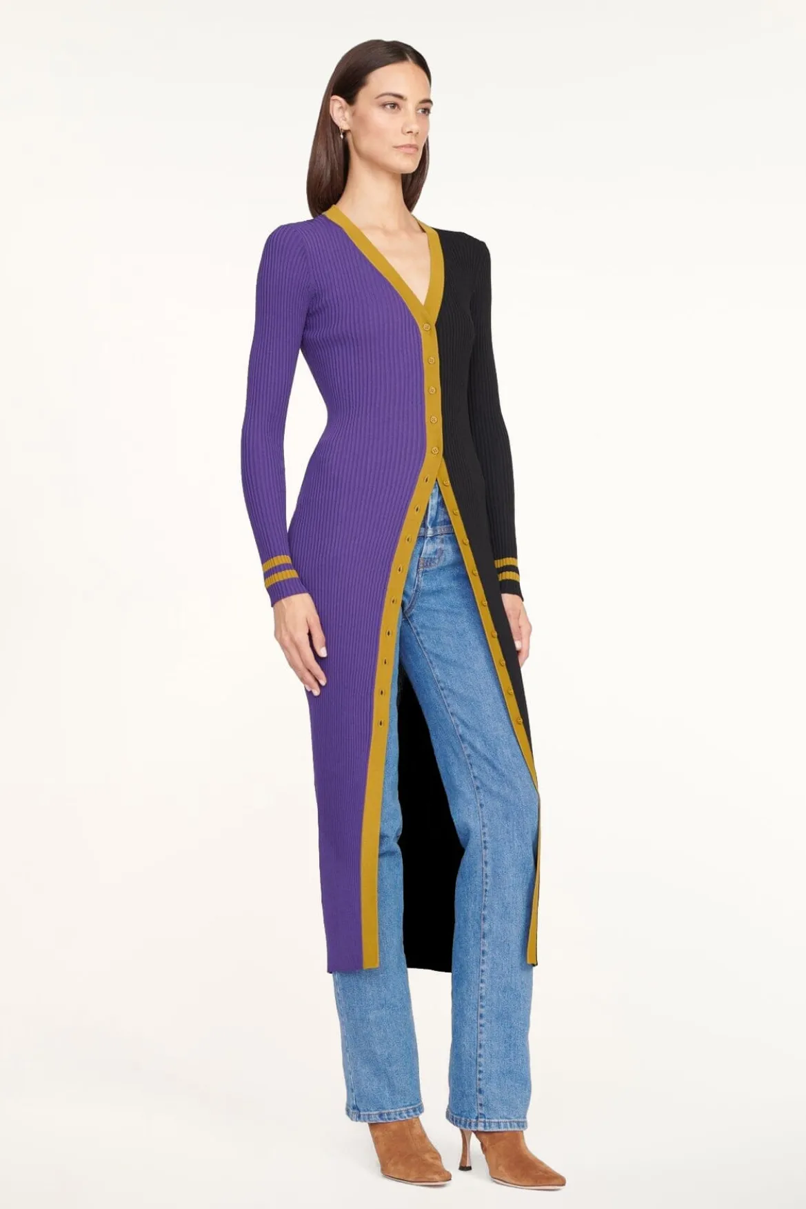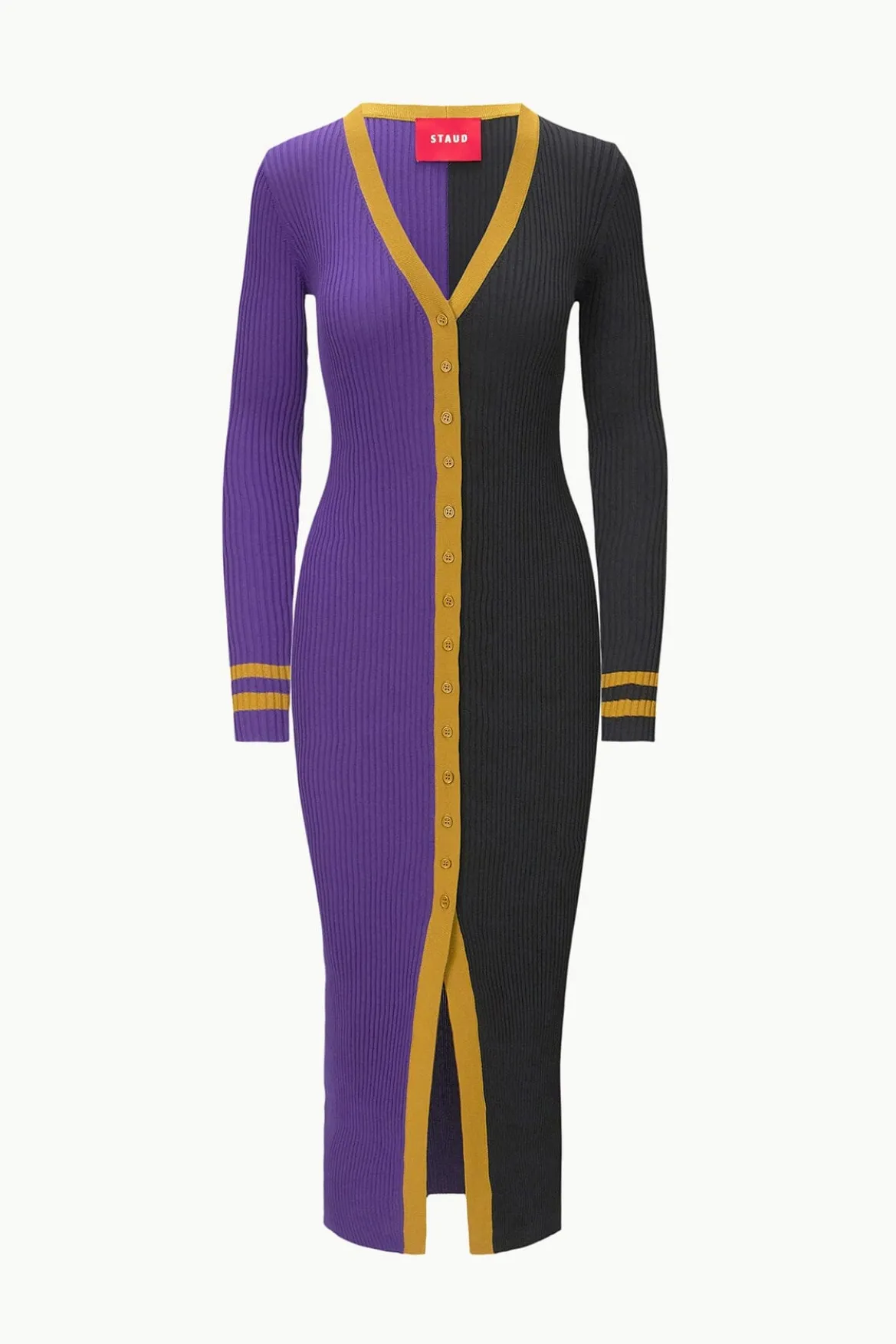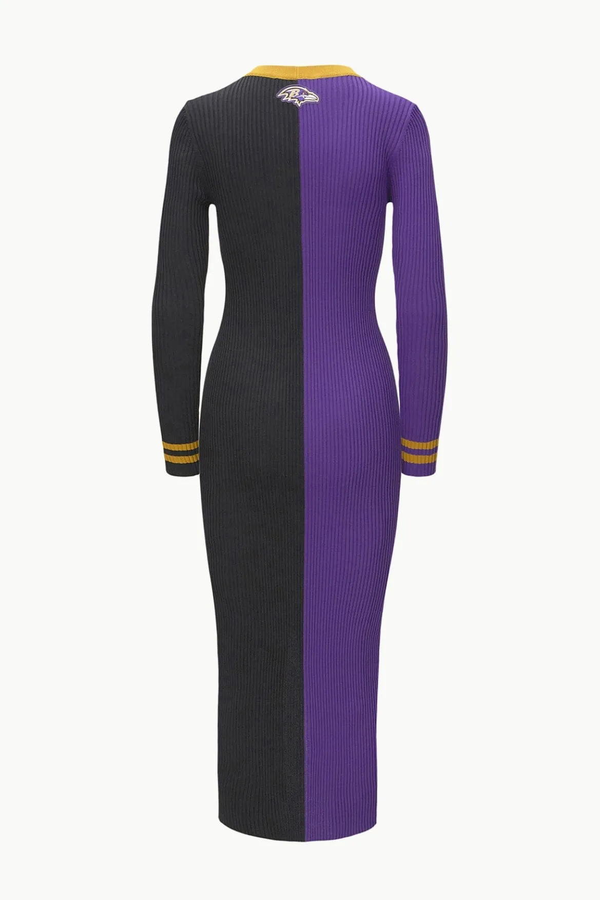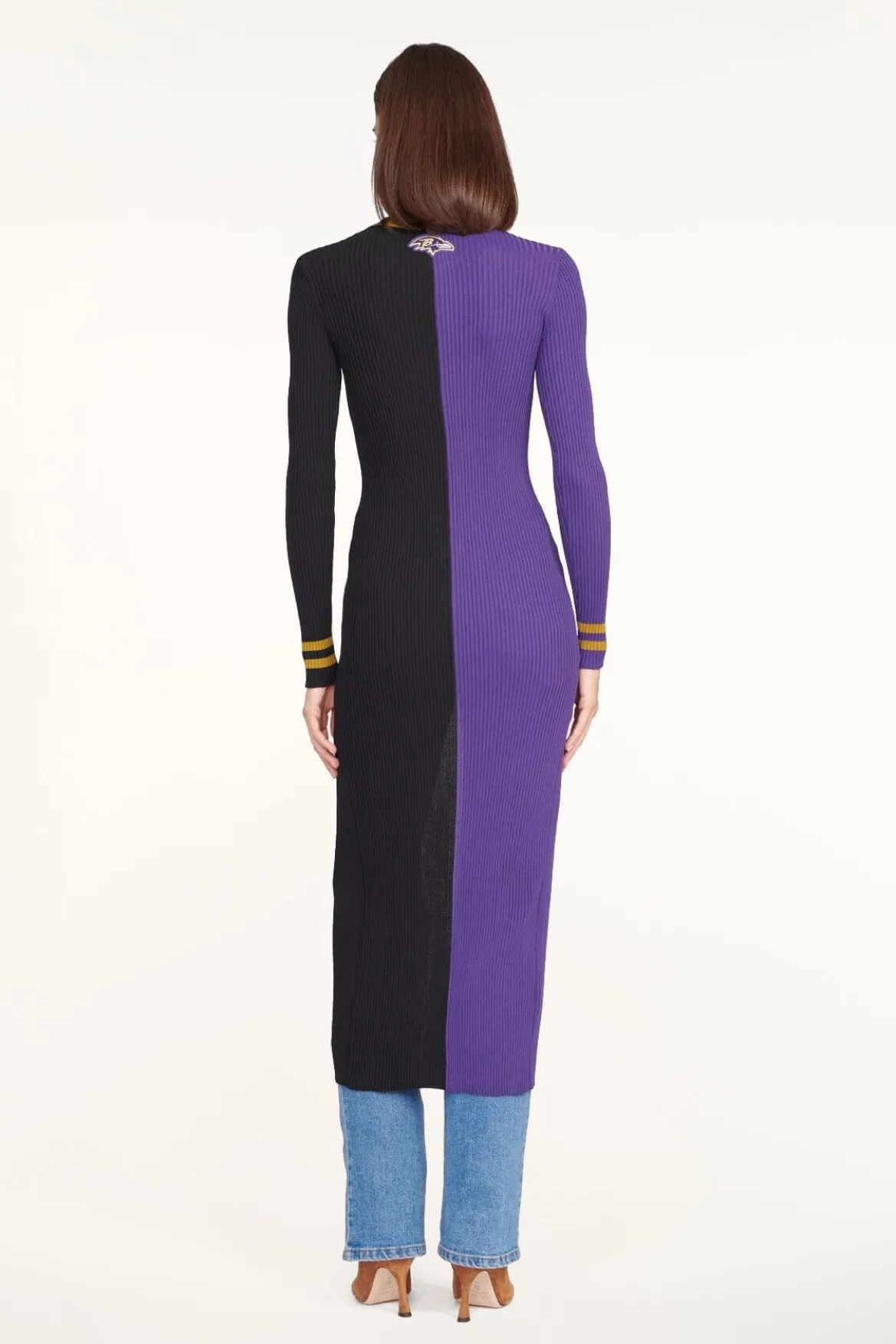 Our signature style, the Shoko Sweater, is updated to support your favorite NFL teams. The NFL STAUD Shoko Sweater is made out of our stretchy, comfortable compact rib knit fabric, and can be worn as a cardigan or a dress. This special capsule features our signature color blocked pattern and a NFL team logo on the back.