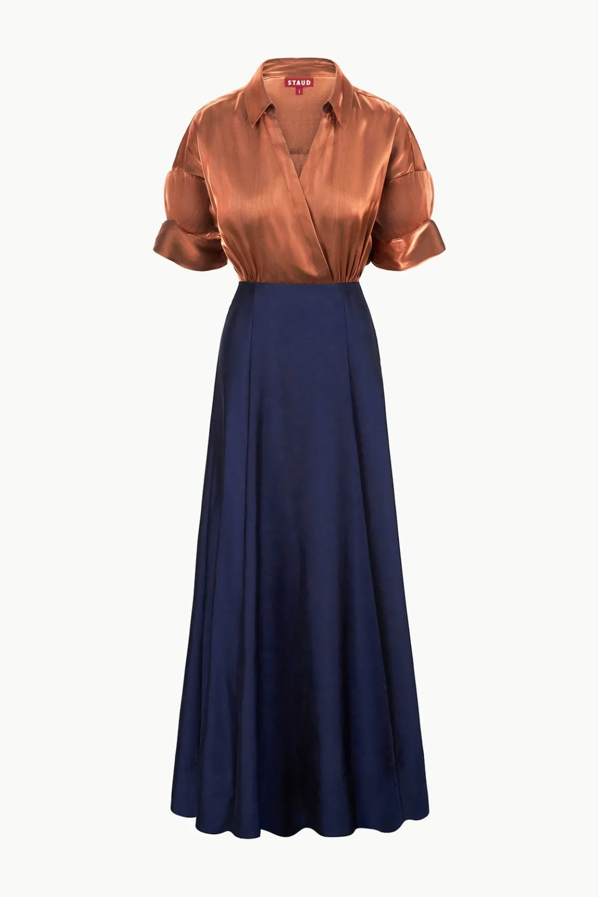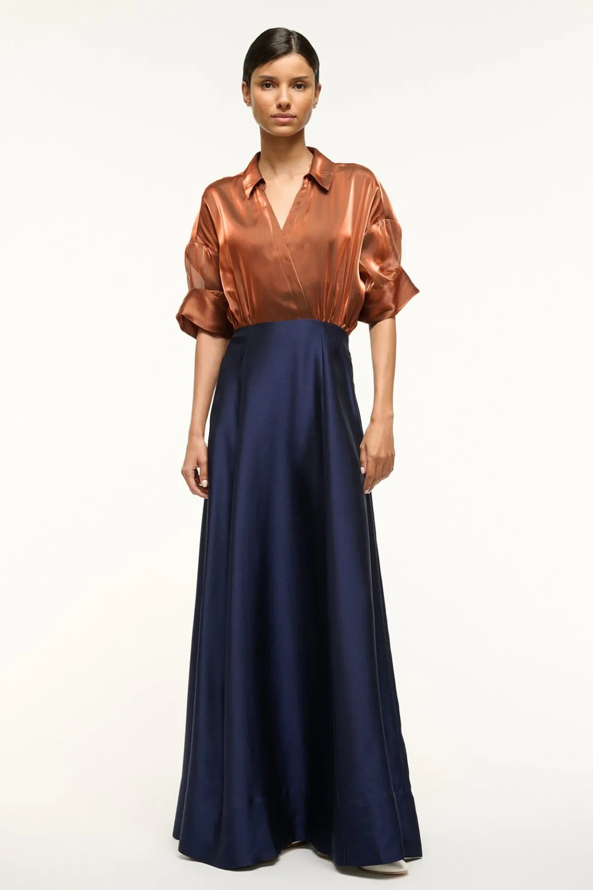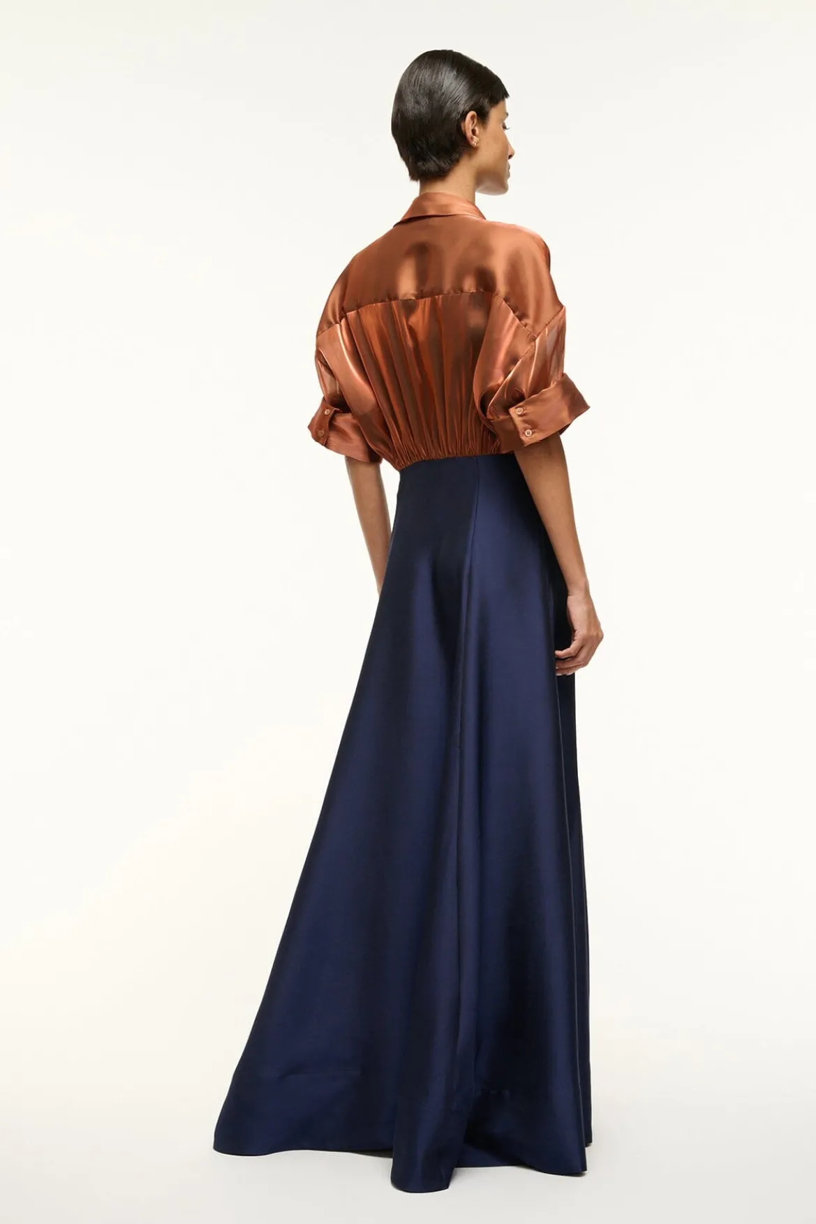 The Shubert Dress is a mixed media gown combining iridescent organza and a silk wood blend maxi skirt to create a two-for-one occasion look.