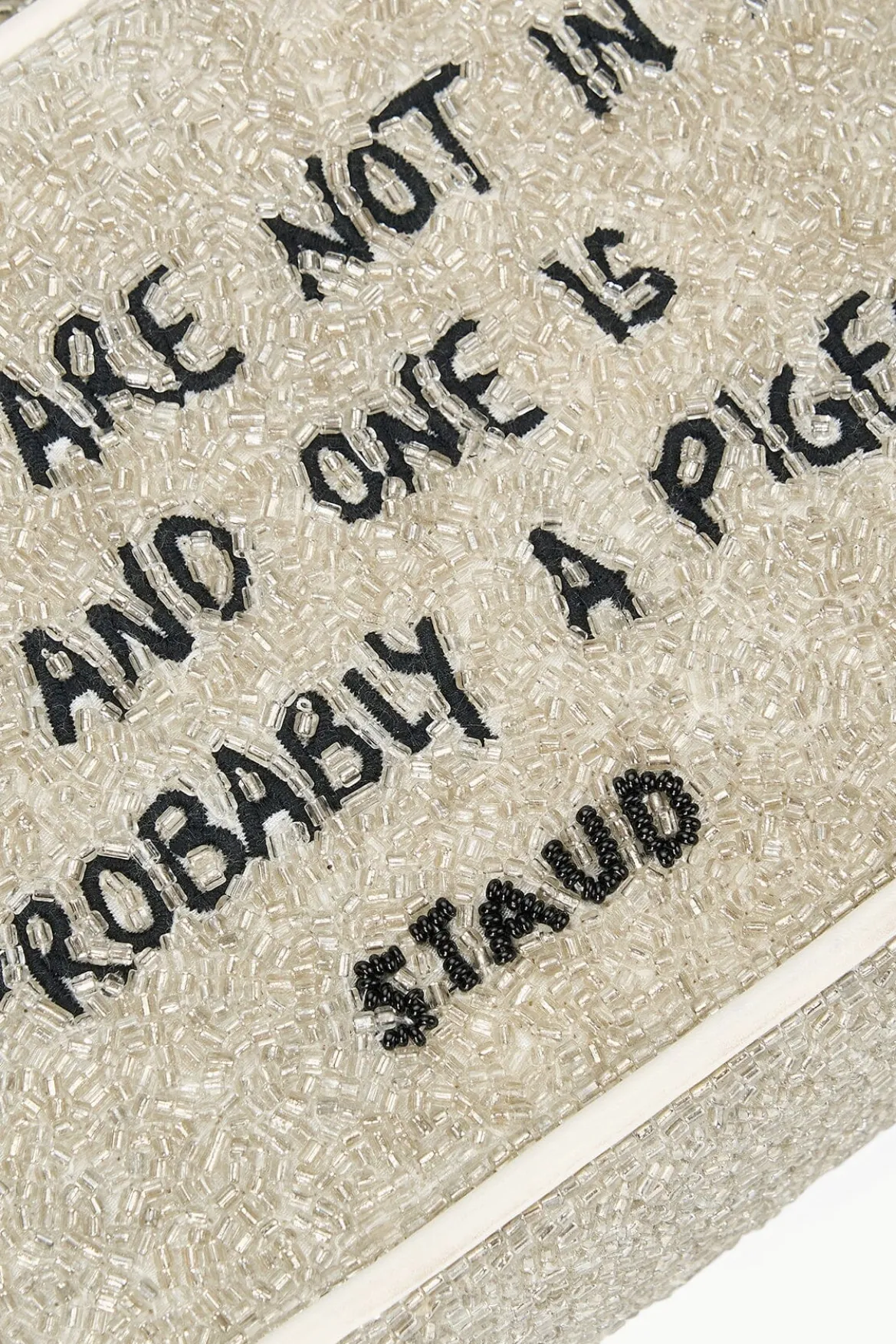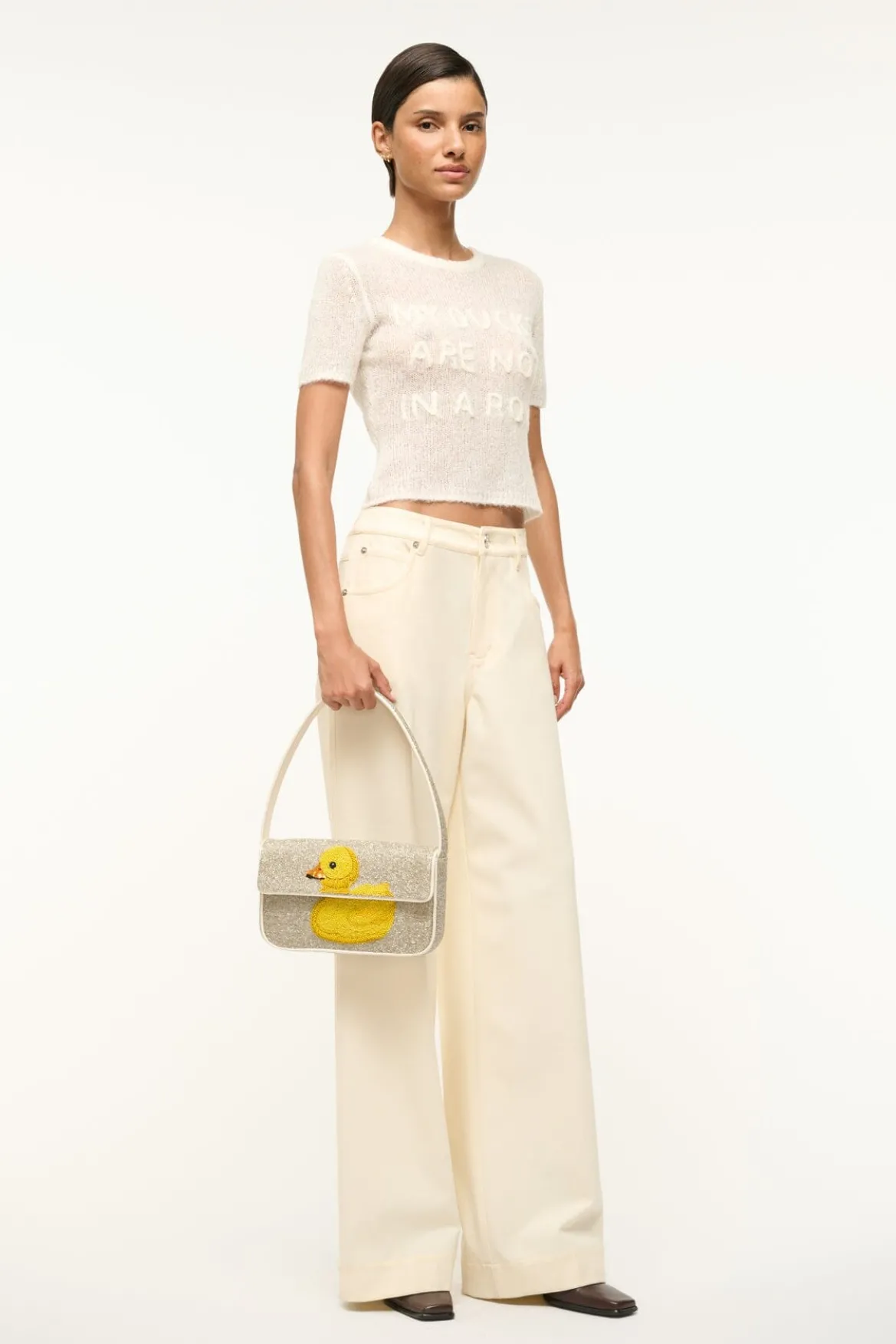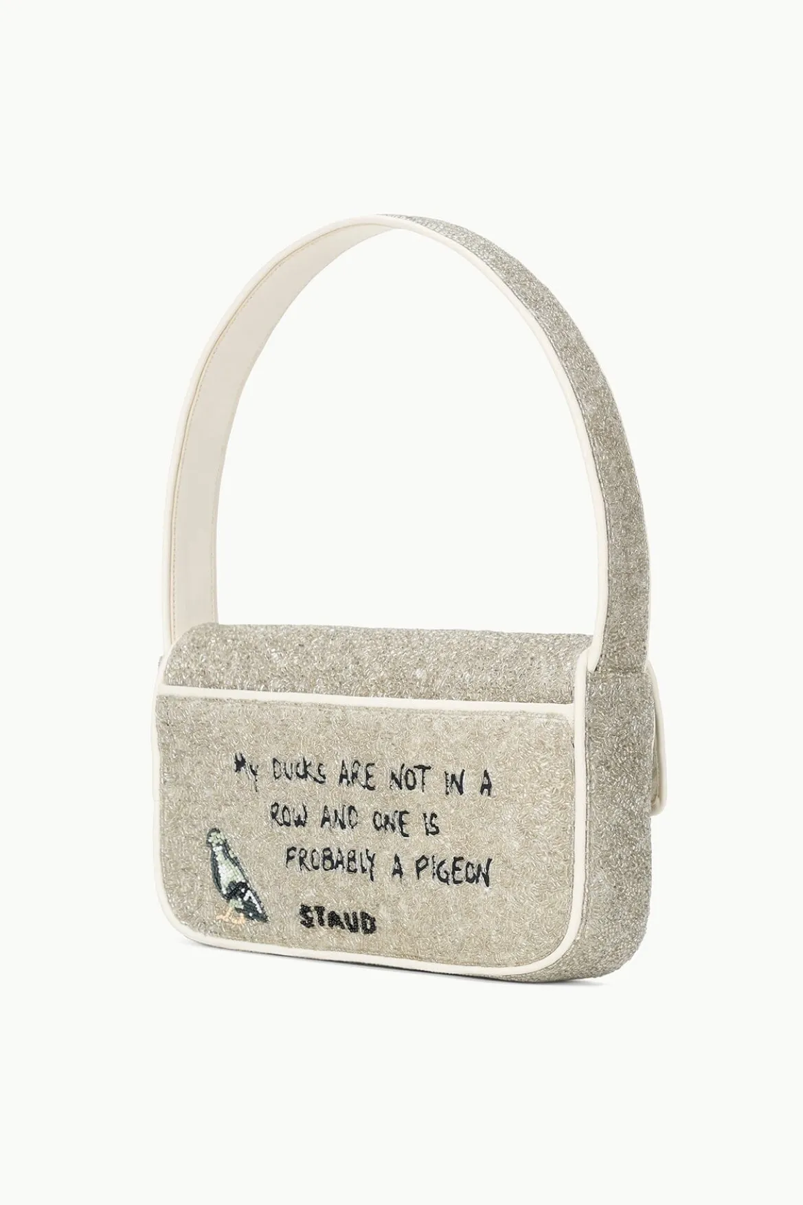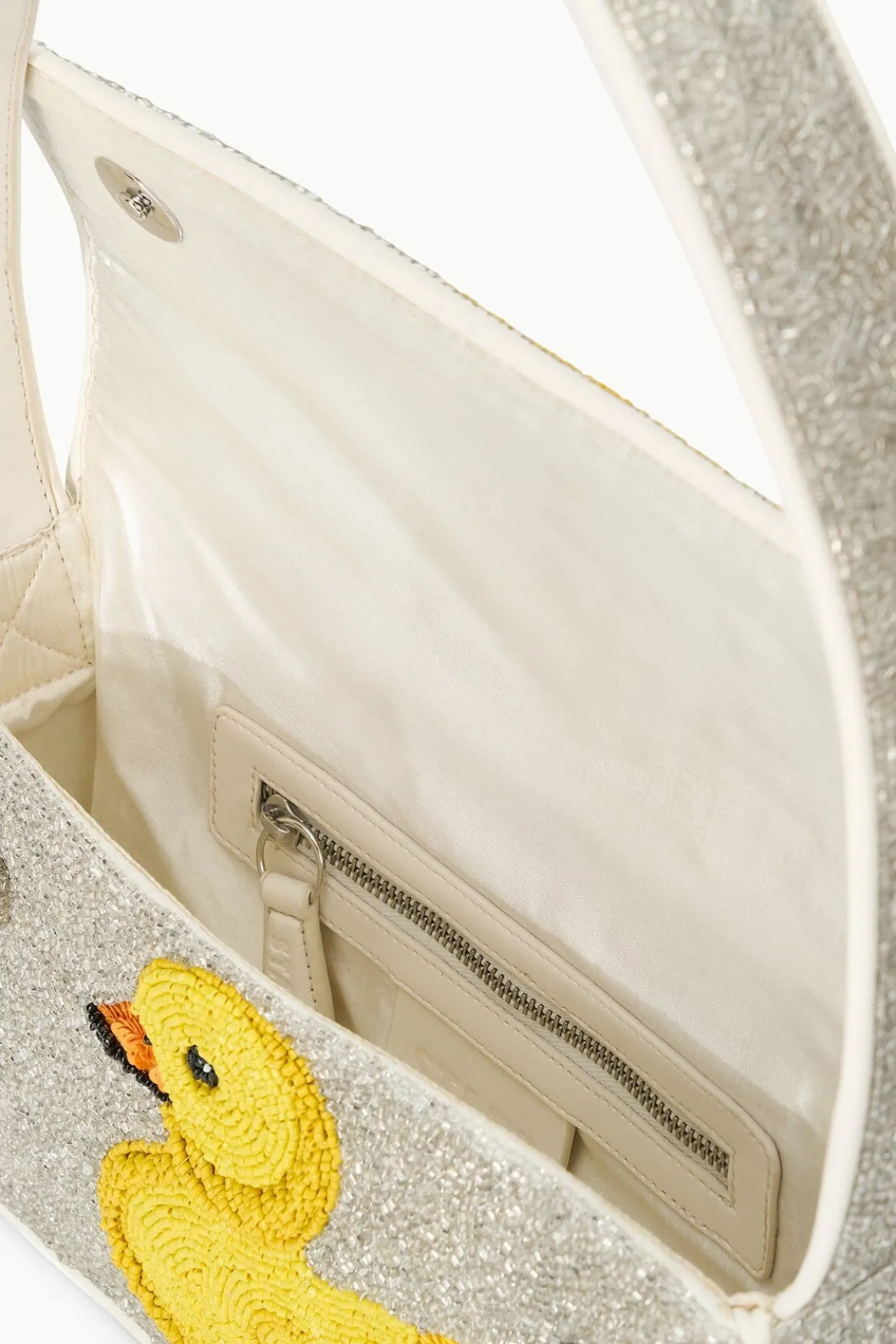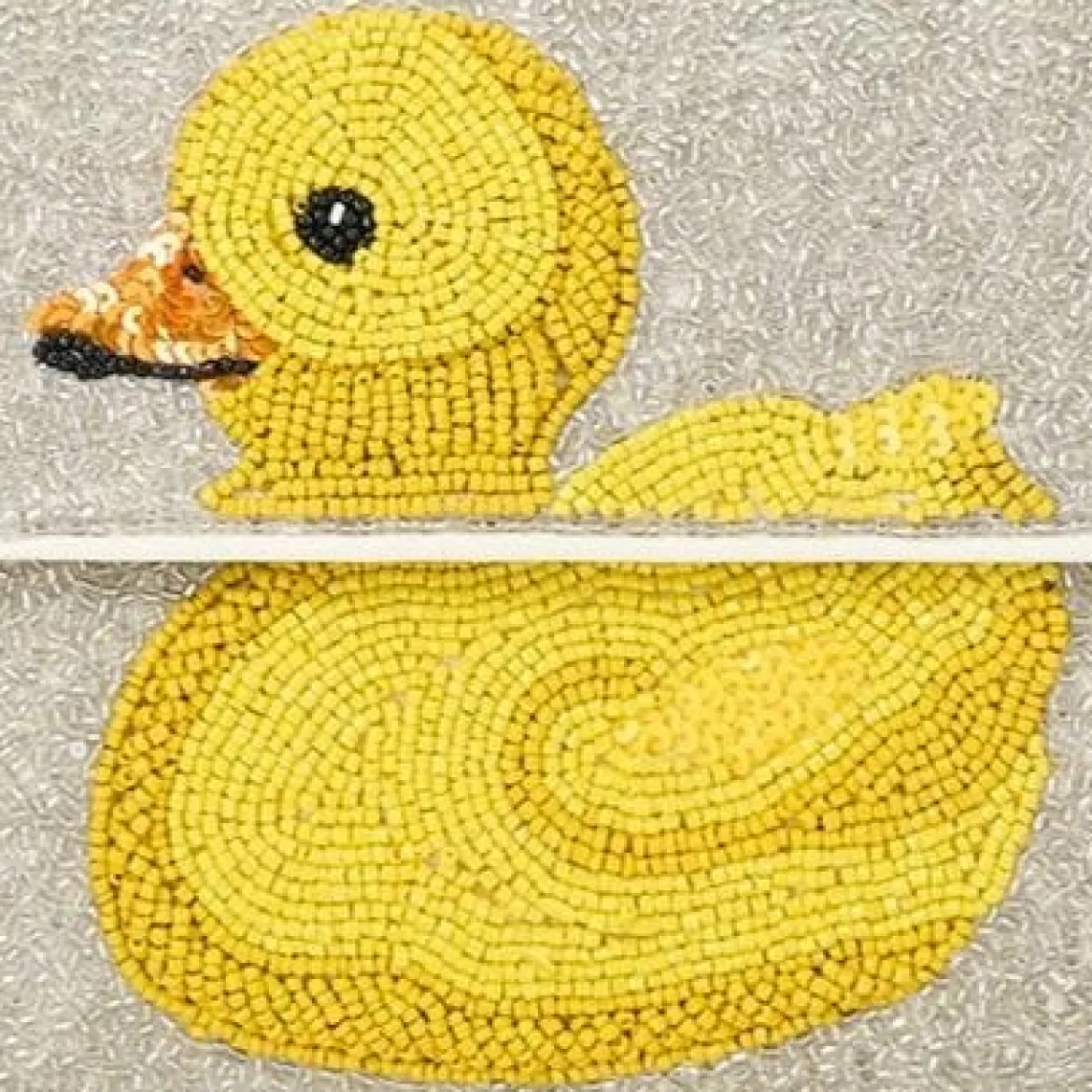 Our best-selling, hand-beaded shoulder bag has been updated with a playful duck pattern. The Tommy features vegan leather piping, a back slip pocket, magnetic snap closure, and interior satin lining.