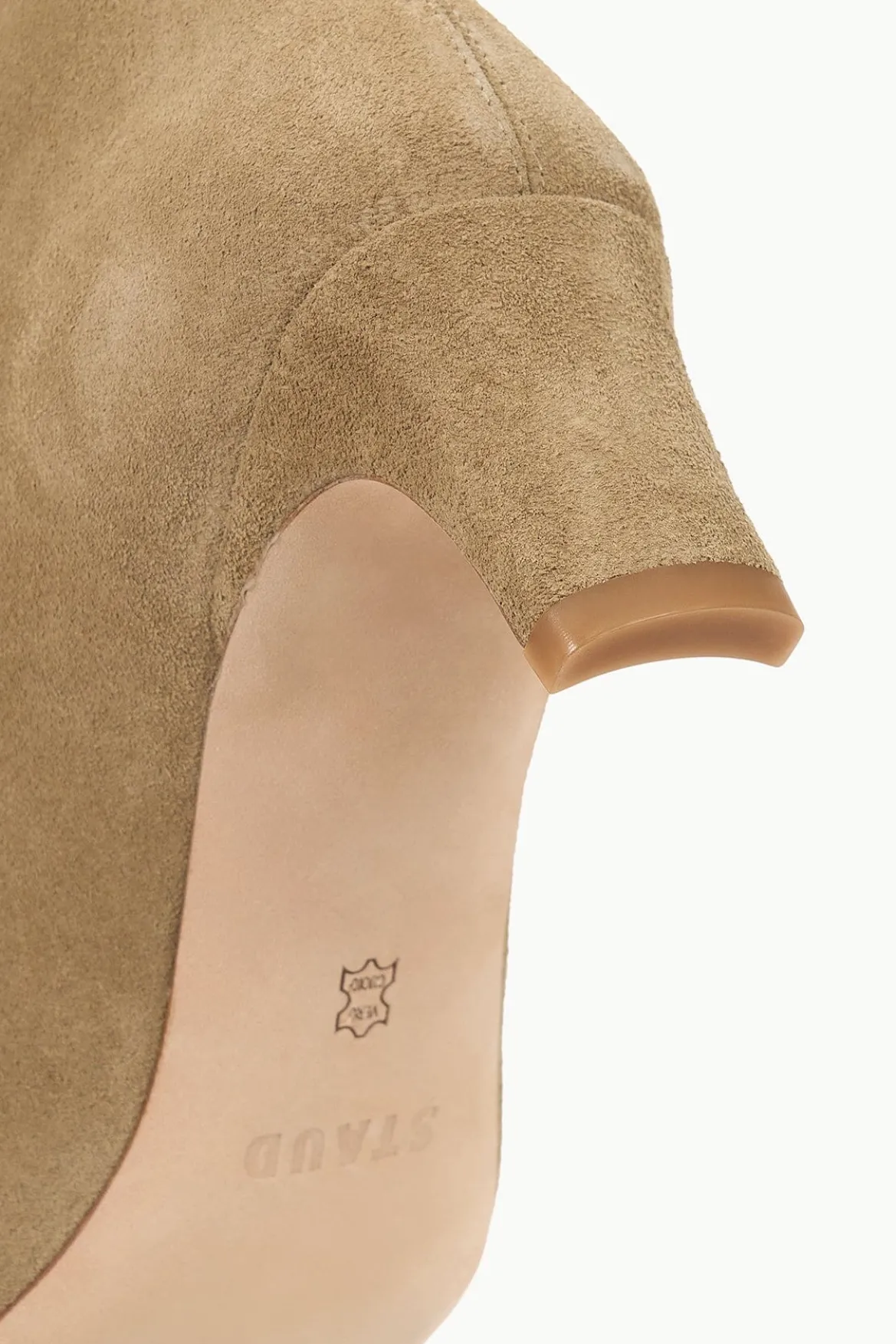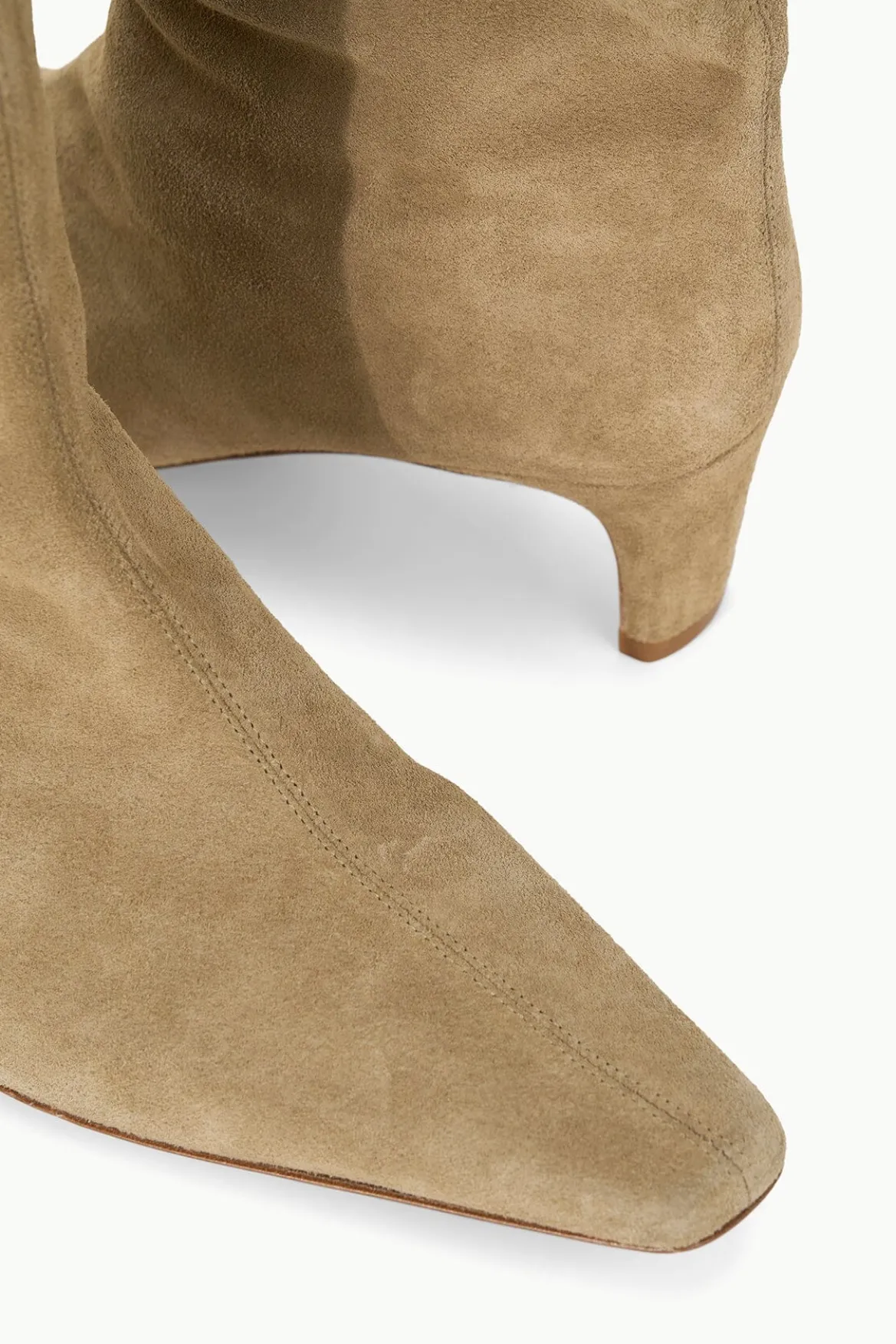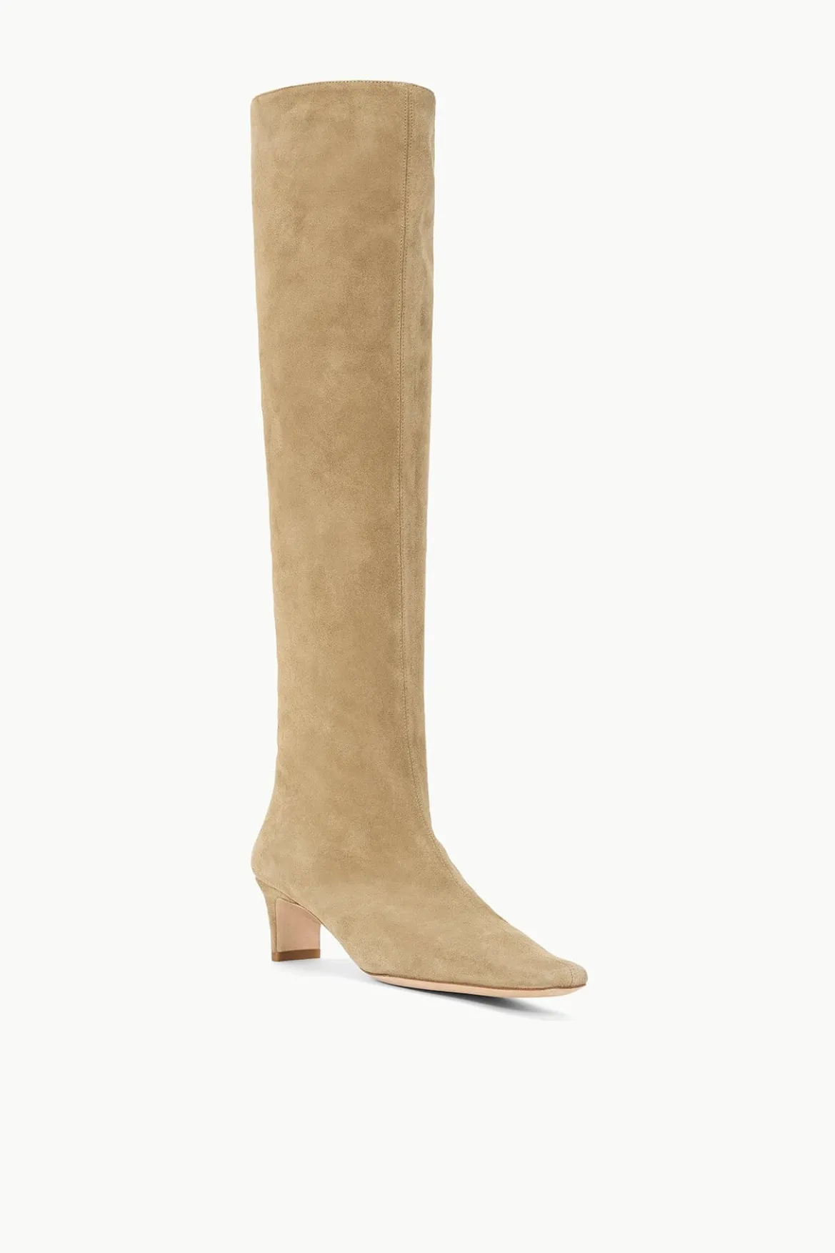 The Wally is a slouchy, suede knee-high boot featuring a pointed toe and a slim heel design.