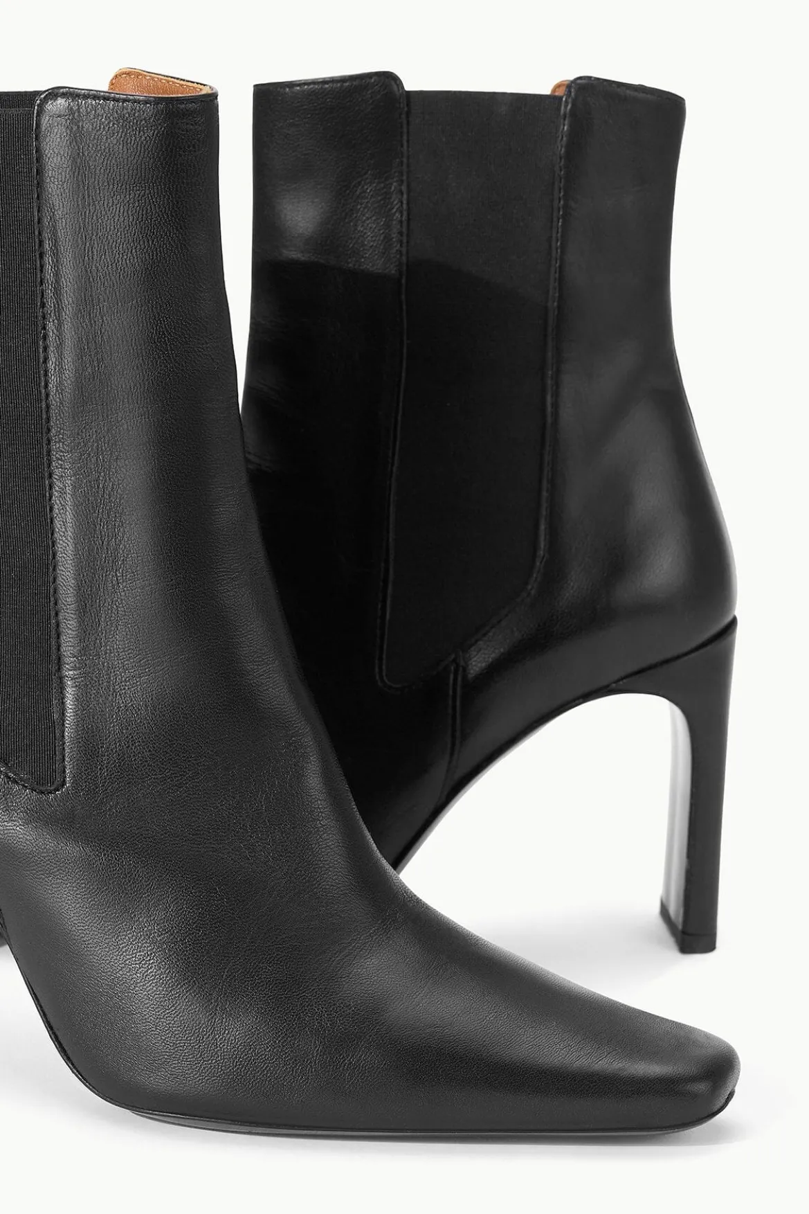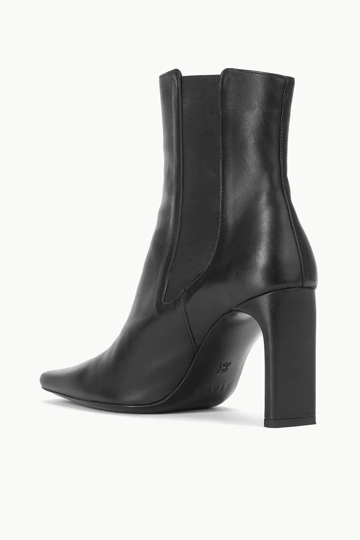 A nappa leather high heel ankle boot with an elastic gore and blade heel.
